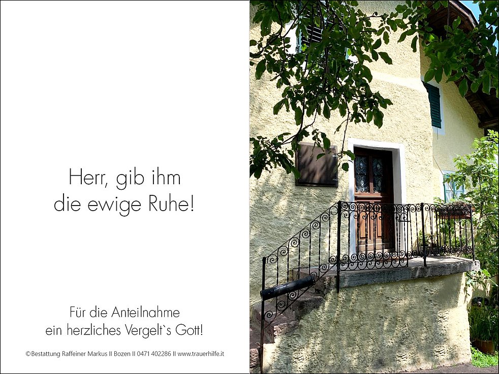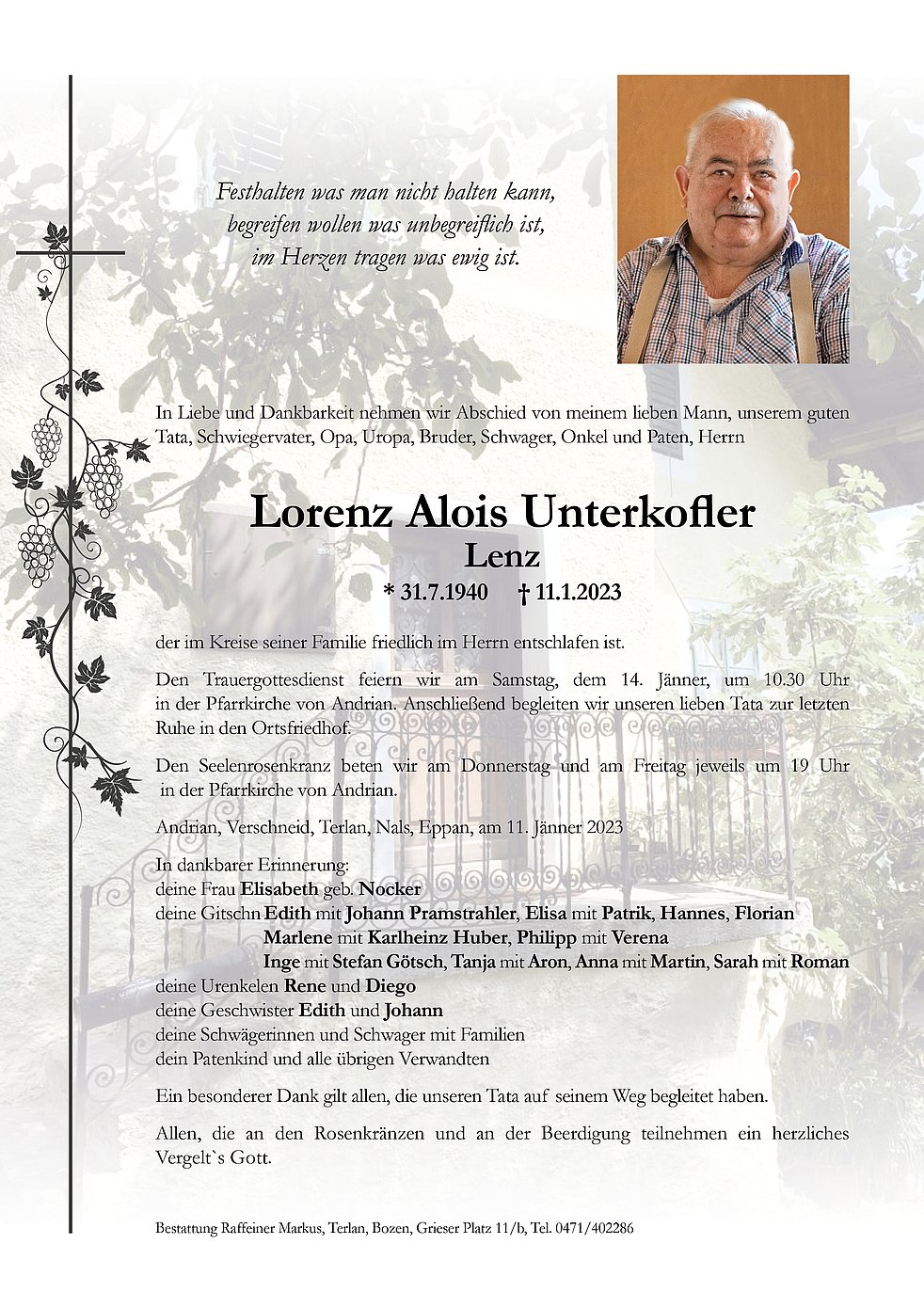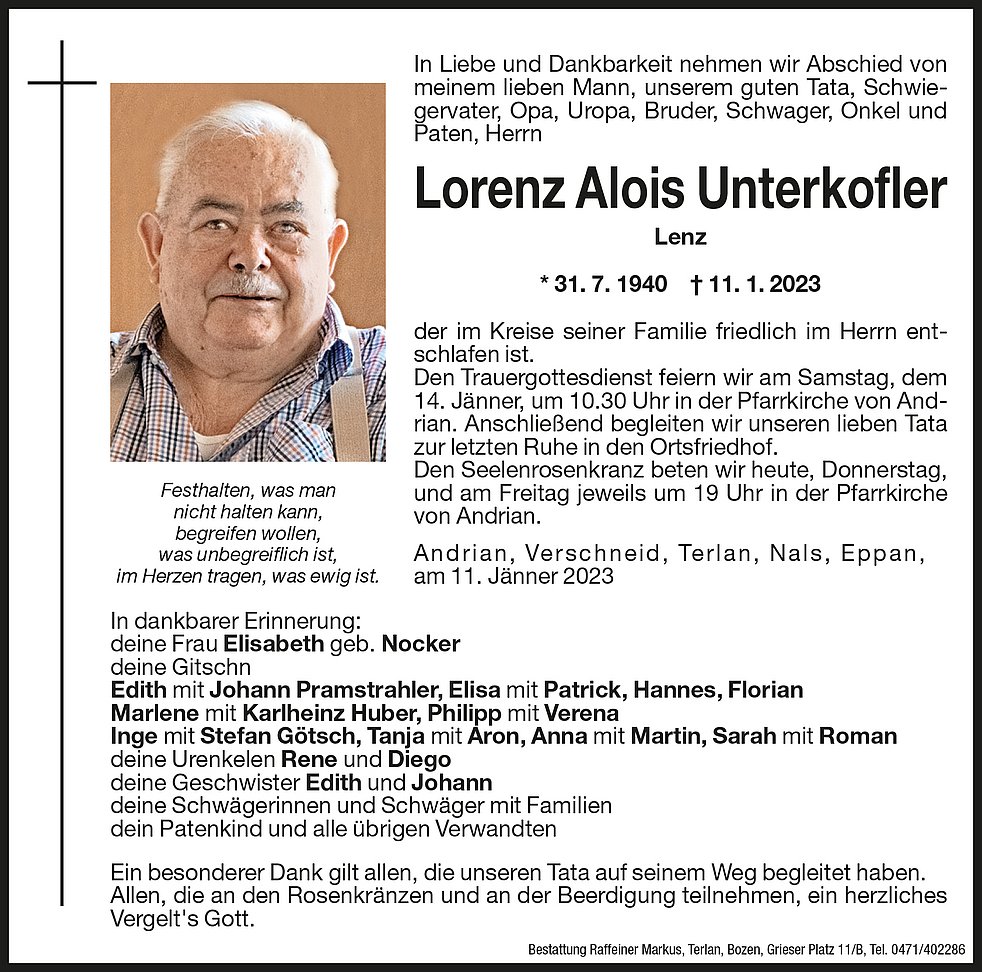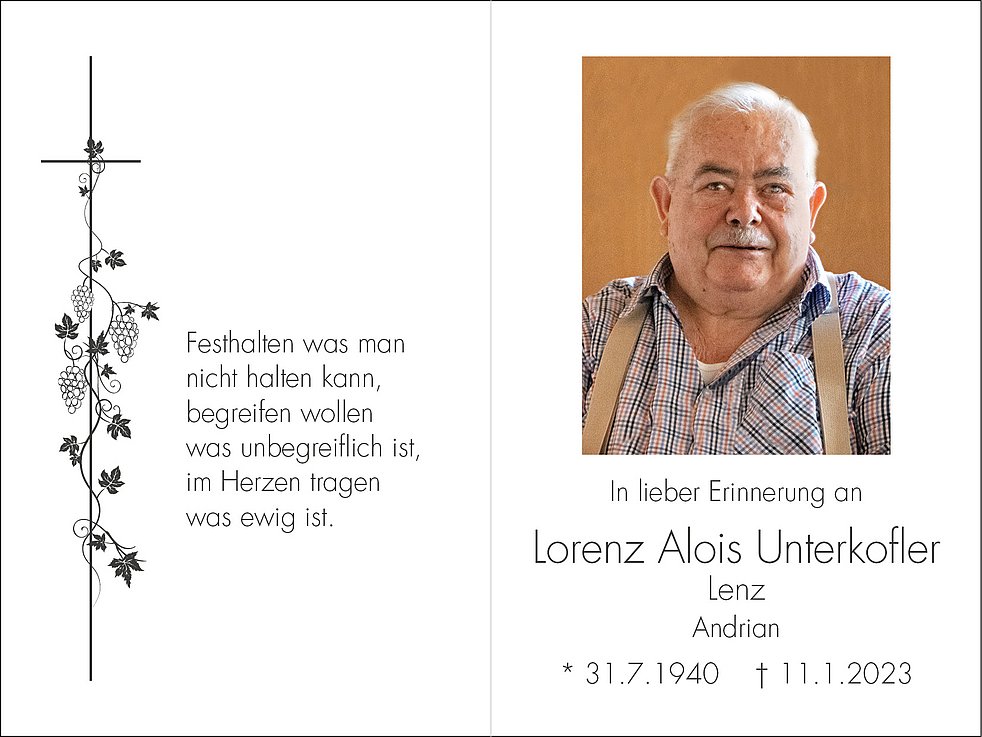 Den Trauergottesdienst feiern wir am Samstag, dem 14. Jänner, um 10.30 Uhr in der Pfarrkirche von Andrian. Anschließend begleiten wir unseren lieben Tata zur letzten Ruhe in den Ortsfriedhof.