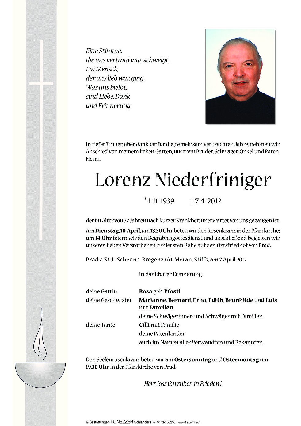 Am Dienstag, 10. April, um 13.30 Uhr beten wir den Rosenkranz in der Pfarrkirche; um 14 Uhr feiern wir den Begräbnisgottesdienst und anschließend begleiten wir unseren lieben Verstorbenen zur letzten Ruhe auf den Ortsfriedhof von Prad.