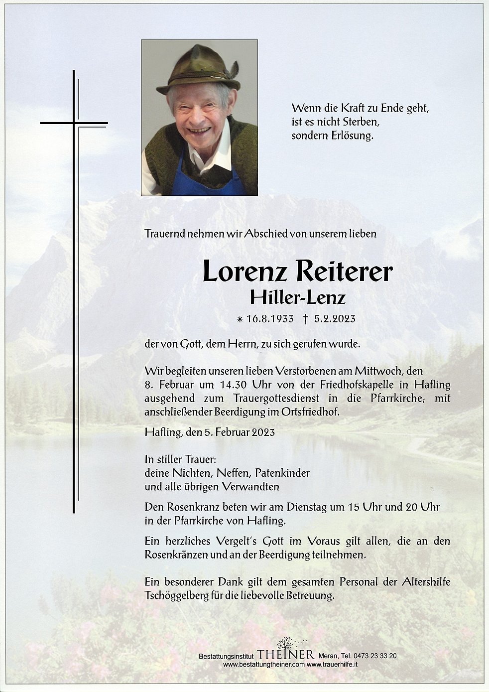 Wir begleiten unseren lieben Verstorbenen am Mittwoch, den 8. Februar um 14.30 Uhr von der Friedhofskapelle in Hafling ausgehend zum Trauergottesdienst in die Pfarrkirche; mit anschließender Beerdigung im Ortsfriedhof.