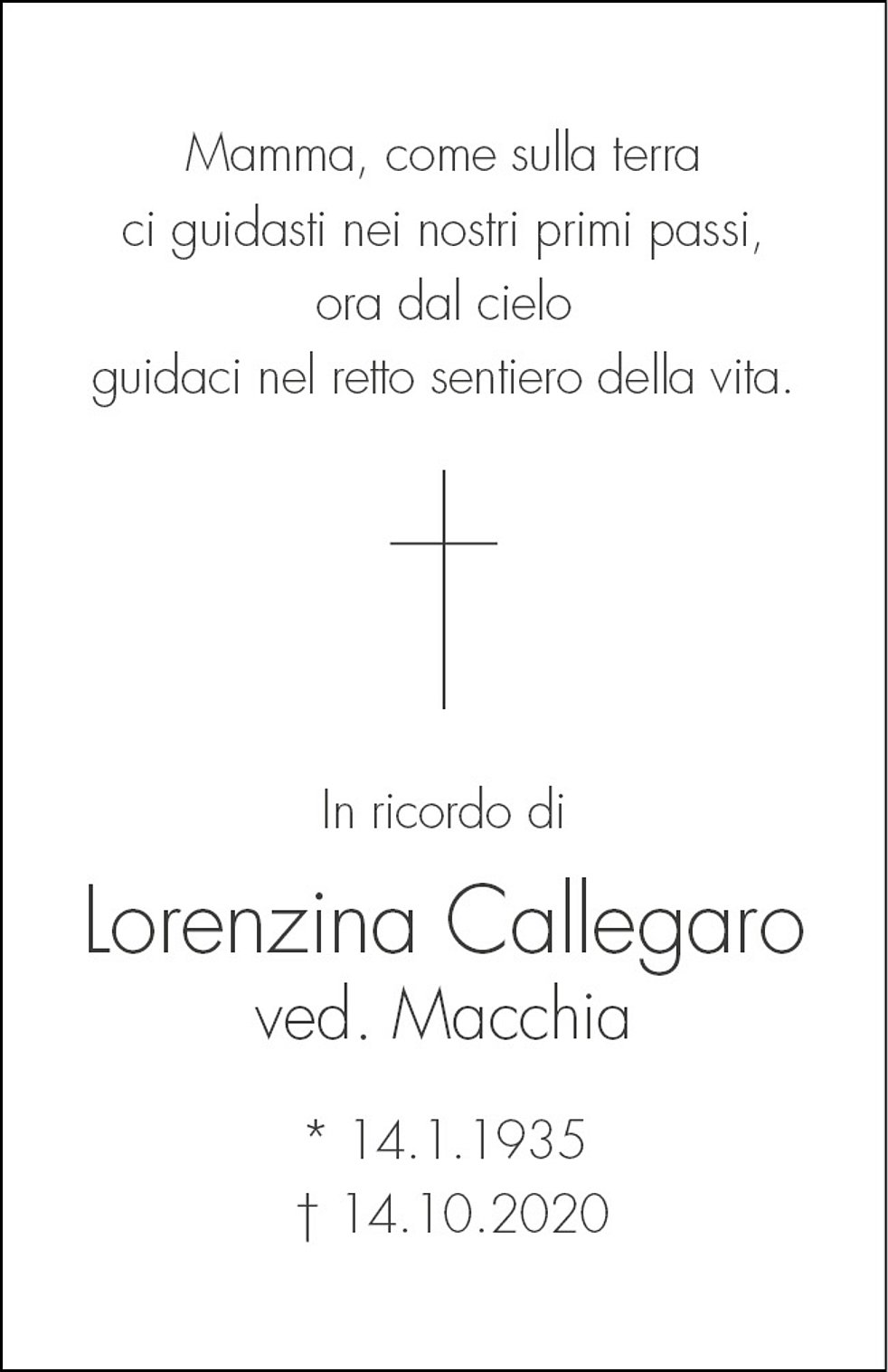 La S. Messa in suffragio verrà celebrata lunedì, 19 ottobre alle ore 10.30 nella chiesa parrocchiale San Giovanni Bosco, indi la nostra cara verrà cremata.