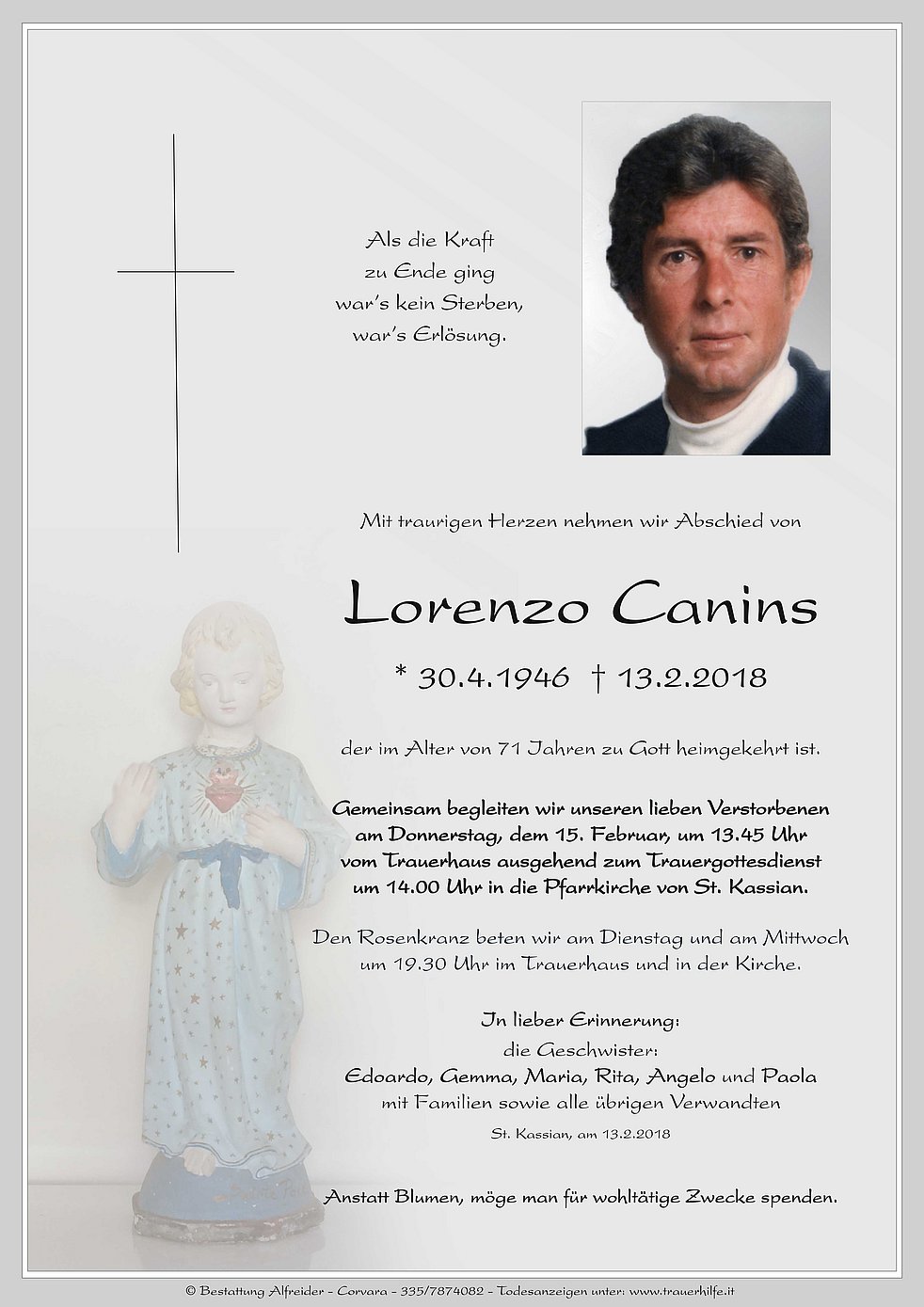 Gemeinsam begleiten wir unseren lieben Verstorbenen am Donnerstag, dem 15. Februar, um 13.45 Uhr vom Trauerhaus ausgehend zum Trauergottesdienst um 14.00 Uhr in die Pfarrkirche von St. Kassian.