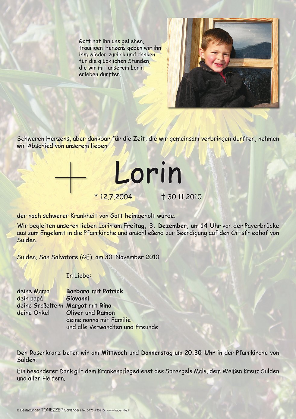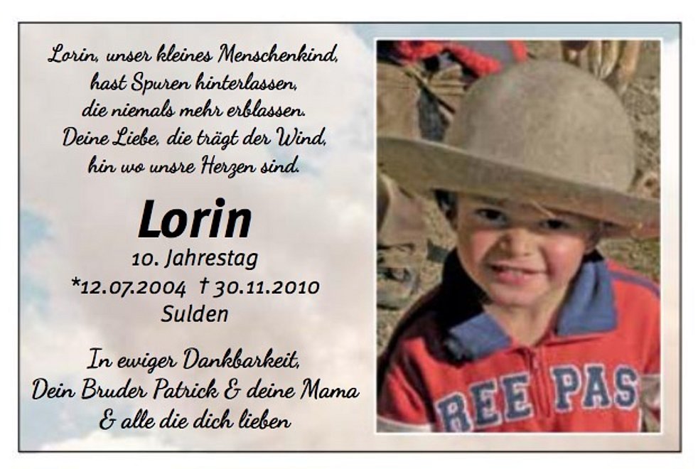 Wir begleiten unseren lieben Lorin am Freitag, 3. Dezember, um 14 Uhr von der Payerbrücke aus zum Engelamt in die Pfarrkirche und anschließend zur Beerdigung auf den Ortsfriedhof von Sulden.