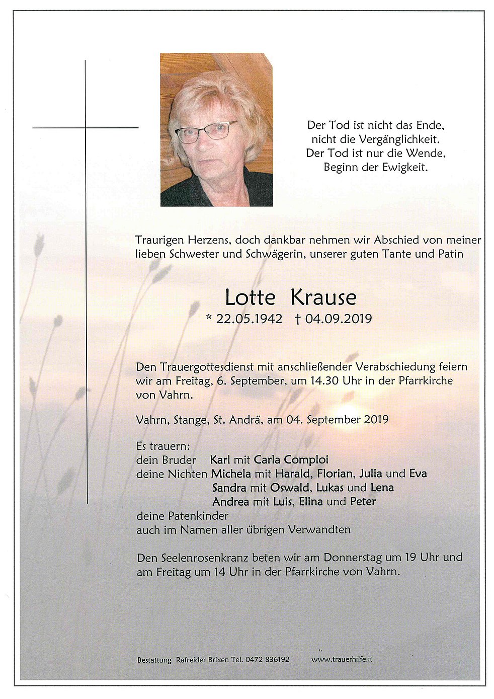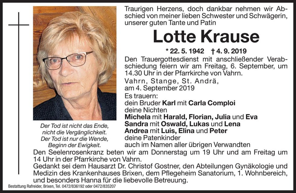 Den Trauergottesdienst mit anschließender Verabschiedung feiern wir am Freitag, 6. September, um 14.30 Uhr in der Pfarrkirche von Vahrn.