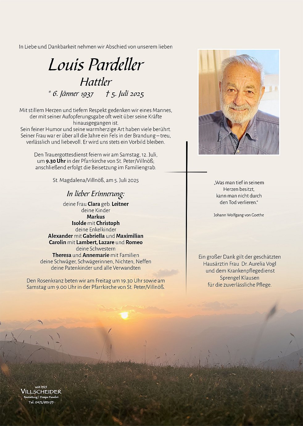 Begräbnisgottesdienst: 12.07. - 09:30 Uhr St. Peter/Villnöß