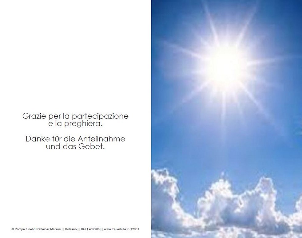 La S. Messa in suffragio avrà luogo presso la chiesa parrocchiale S. Giovanni Bosco a Bolzano il giorno mercoledì 4 luglio alle ore 10.30, seguirà la tumulazione alle ore 14.00 presso il cimitero di Brunico.
