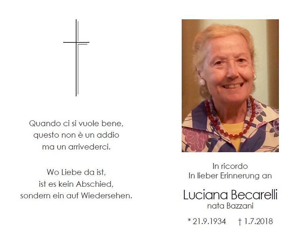 Der Trauergottesdienst findet am Mittwoch, dem 4 Juli, um 10.30 Uhr in der Pfarrkirche S. Giovanni Bosco in Bozen statt. Am Nachmittag, um 14 Uhr, begleiten wir sie zur letzten Ruhe in den Friedhof von Bruneck.