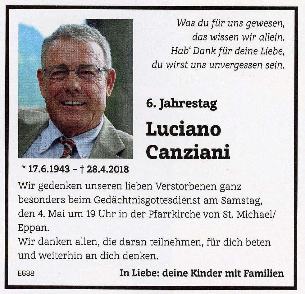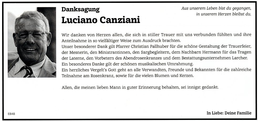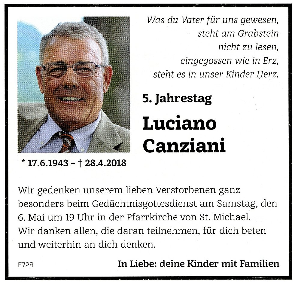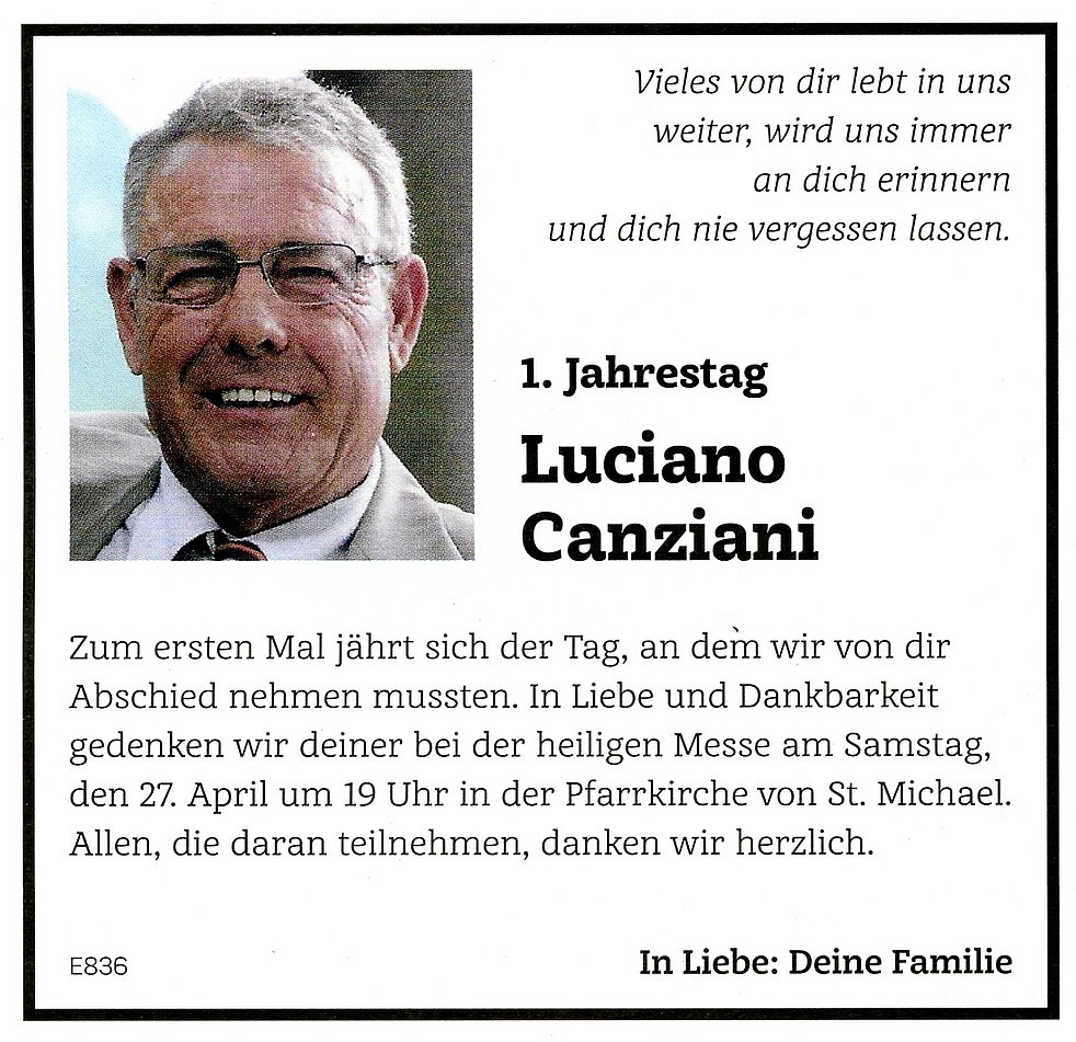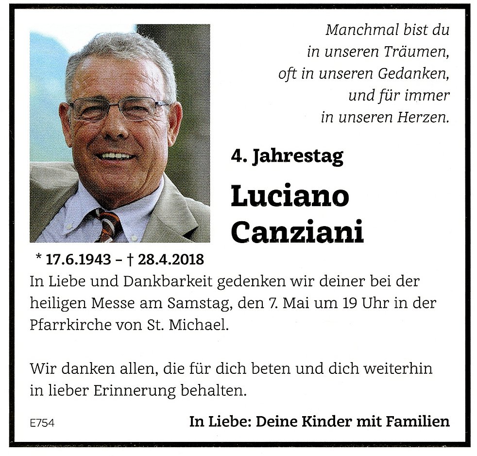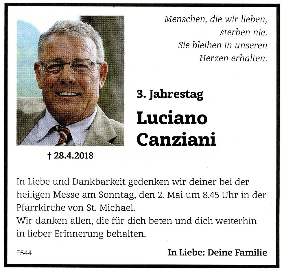 Den Abschiedsgottesdienst feiern wir am Mittwoch, dem 2. Mai um 14.30 Uhr in der Pfarrkirche von St. Michael/Eppan. Anschließend begleiten wir unseren lieben Verstorbenen auf den Ortsfriedhof.