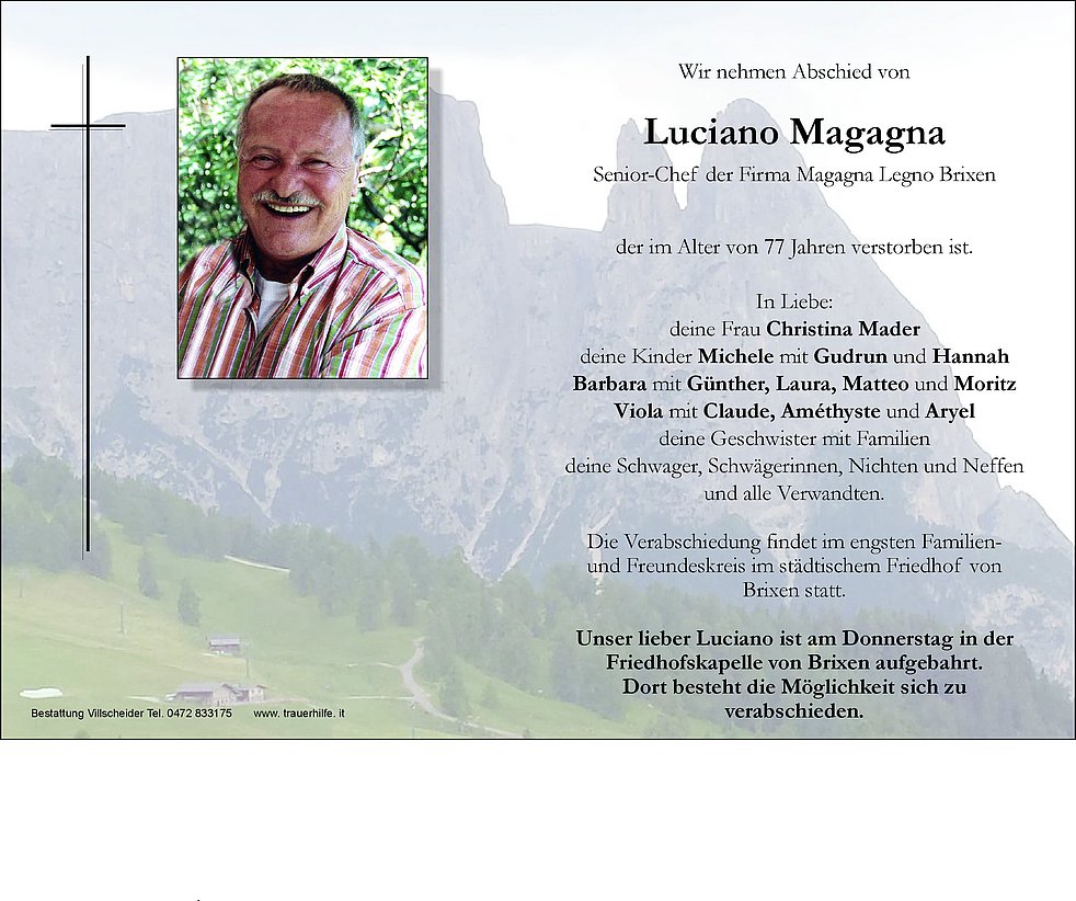 Die Verabschiedung findet im engsten Familien- und Freundeskreis im städtischem Friedhof von Brixen statt.