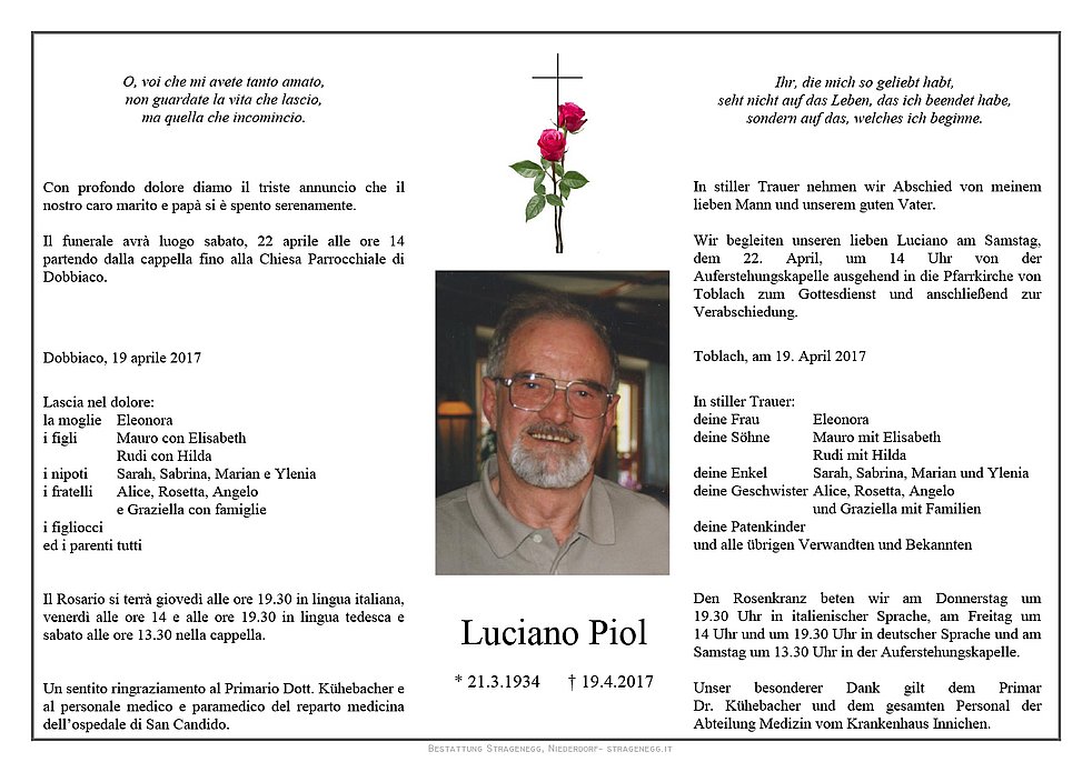 Trauerfeier: 22.04. - 14:00 Uhr Toblach