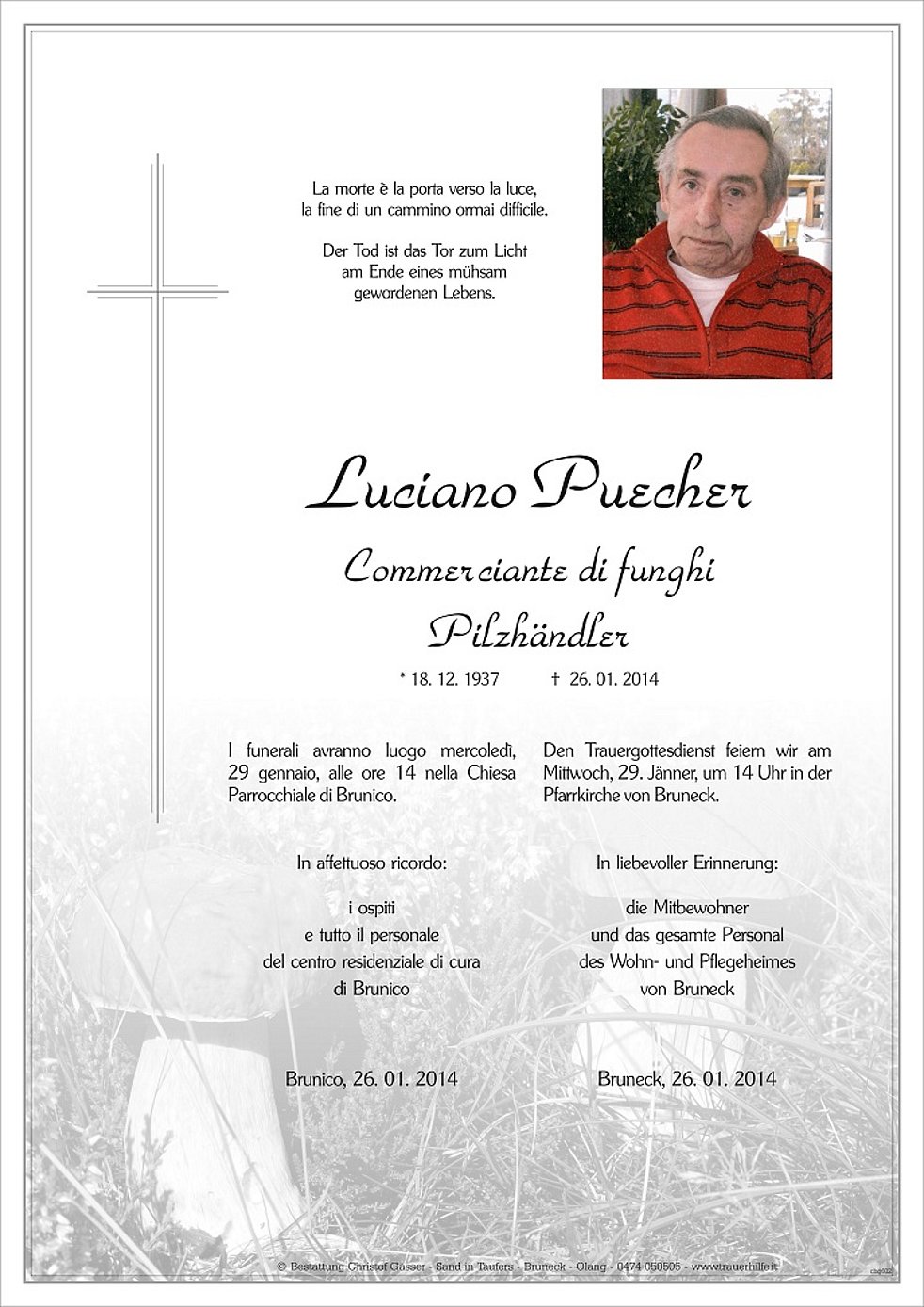 Den Trauergottesdienst feiern wir am Mittwoch, 29. Jänner, um 14 Uhr in der Pfarrkirche von Bruneck.