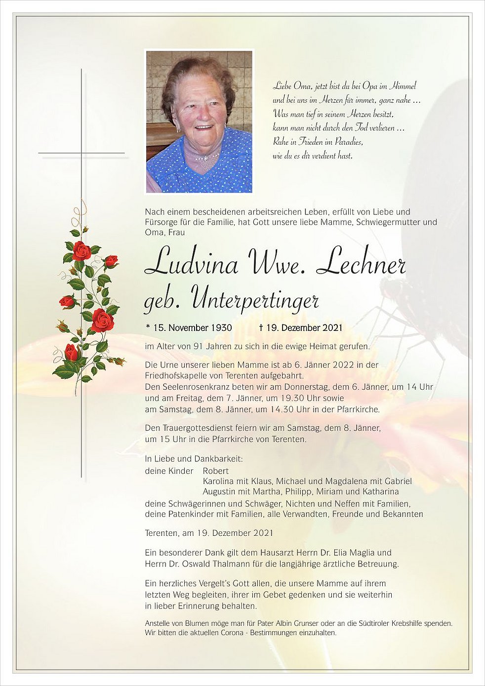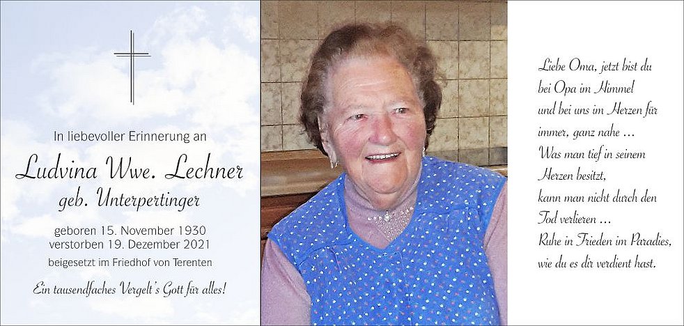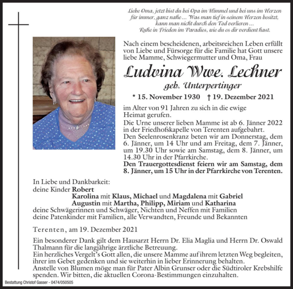 Ludwina kam nach schwierigen Kriegsjahren nach Neustift, das Kochen zu erlernen. Dort erlernte sie gleichzeitig von Prälat Konrad Lechner das Krippenbauen, das zu einer großen Leidenschaft von Ludwina wurde und immer blieb. Gerne gab sie ihr Wissen in Kursen an Interessierte weiter. Als Ludwina nach zehn schönen Jahren von Neustift wieder nach Terenten zurückkam, heiratete sie dort Josef Lechner. Ihren drei Kindern baten sie in ihrem Zuhause Heimat und Geborgenheit. Ludwina war ein Mensch mit großem Gottvertrauen, der sonntägliche Kirchgang gehörte zu ihrem Leben einfach dazu.
