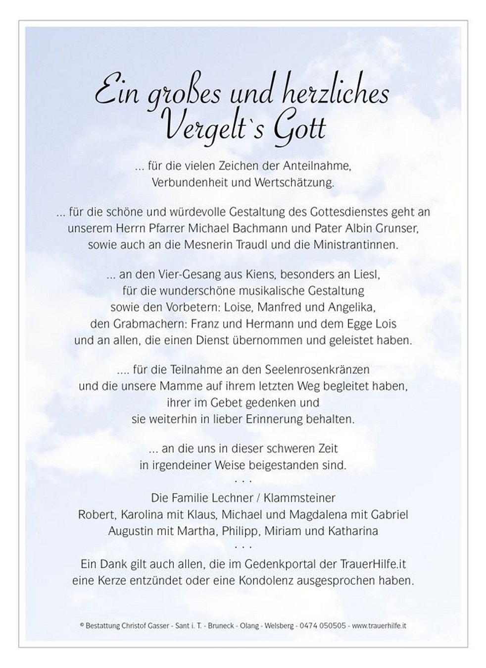 Ein herzliches Vergelt’s Gott allen, die unsere Mamme auf ihrem letzten Weg begleiten, ihrer im Gebet gedenken und sie weiterhin in lieber Erinnerung behalten.