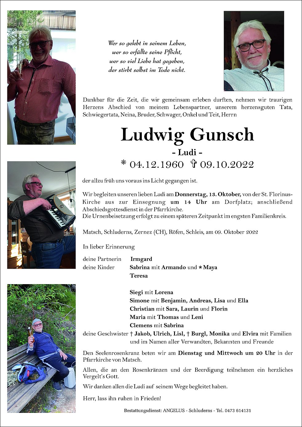 Liebe Sabrina und Teresa. I mecht enk zwoa mein aufrichtiges Beileid ausdrücken. Enker Tata wor sou a liaber, netter hilfsbereiter Mensch. Schod dass er sou friah hot gean gmiasst. Ober er weart a iaz nu ollm af enk oi schaugn und enk beschützen. I wear in Ludi in bester Erinnerung in mein Herz beholten.