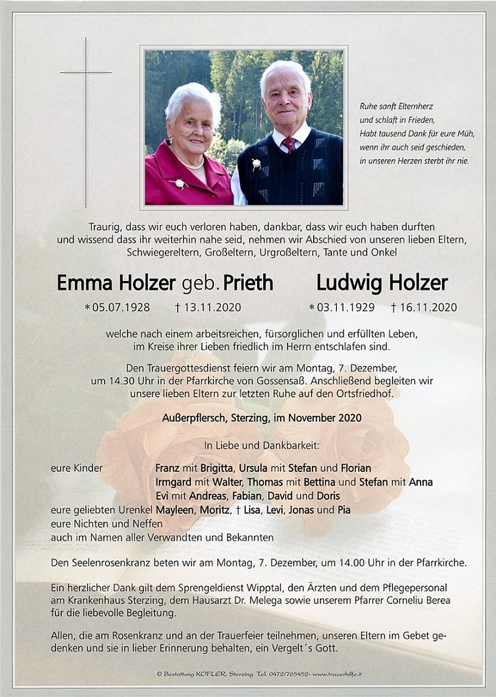 Ein herzlicher Dank gilt dem Sprengeldienst Wipptal, den Ärzten und dem Pflegepersonal am Krankenhaus Sterzing, dem Hausarzt Dr. Melega sowie unserem Pfarrer Corneliu Berea für die liebevolle Begleitung.