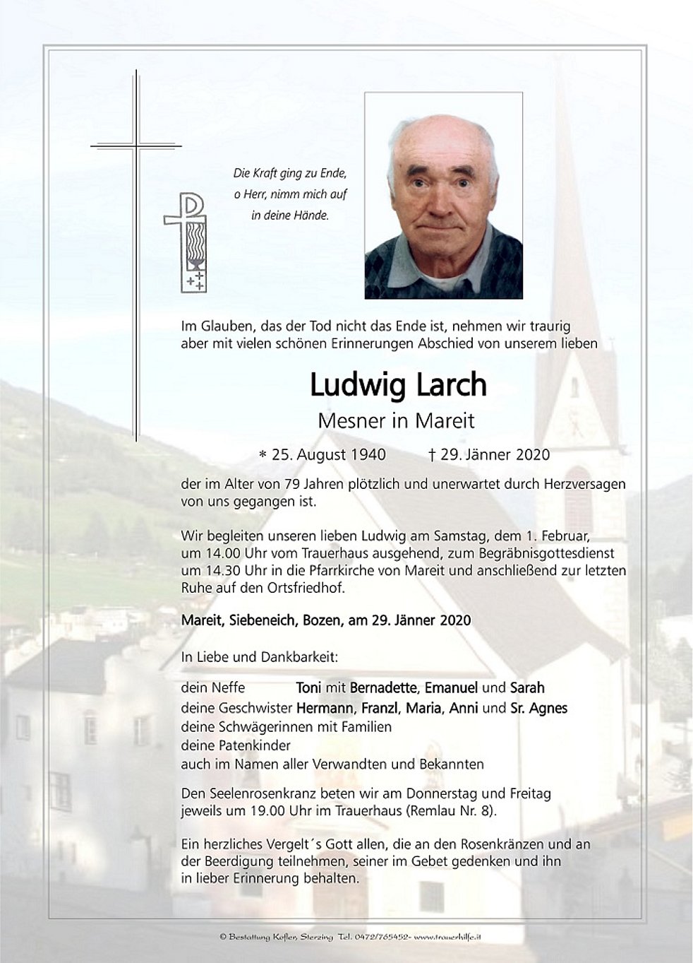 Wir begleiten unseren lieben Ludwig am Samstag, dem 1. Februar, um 14.00 Uhr vom Trauerhaus ausgehend, zum Begräbnisgottesdienst um 14.30 Uhr in die Pfarrkirche von Mareit und anschließend zur letzten Ruhe auf den Ortsfriedhof.