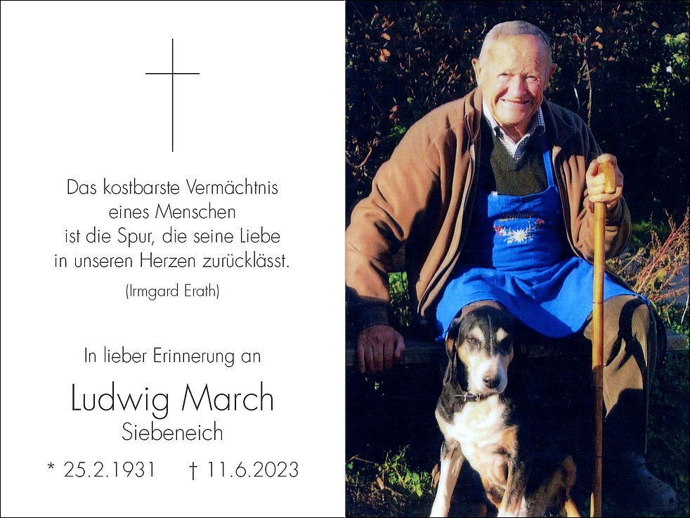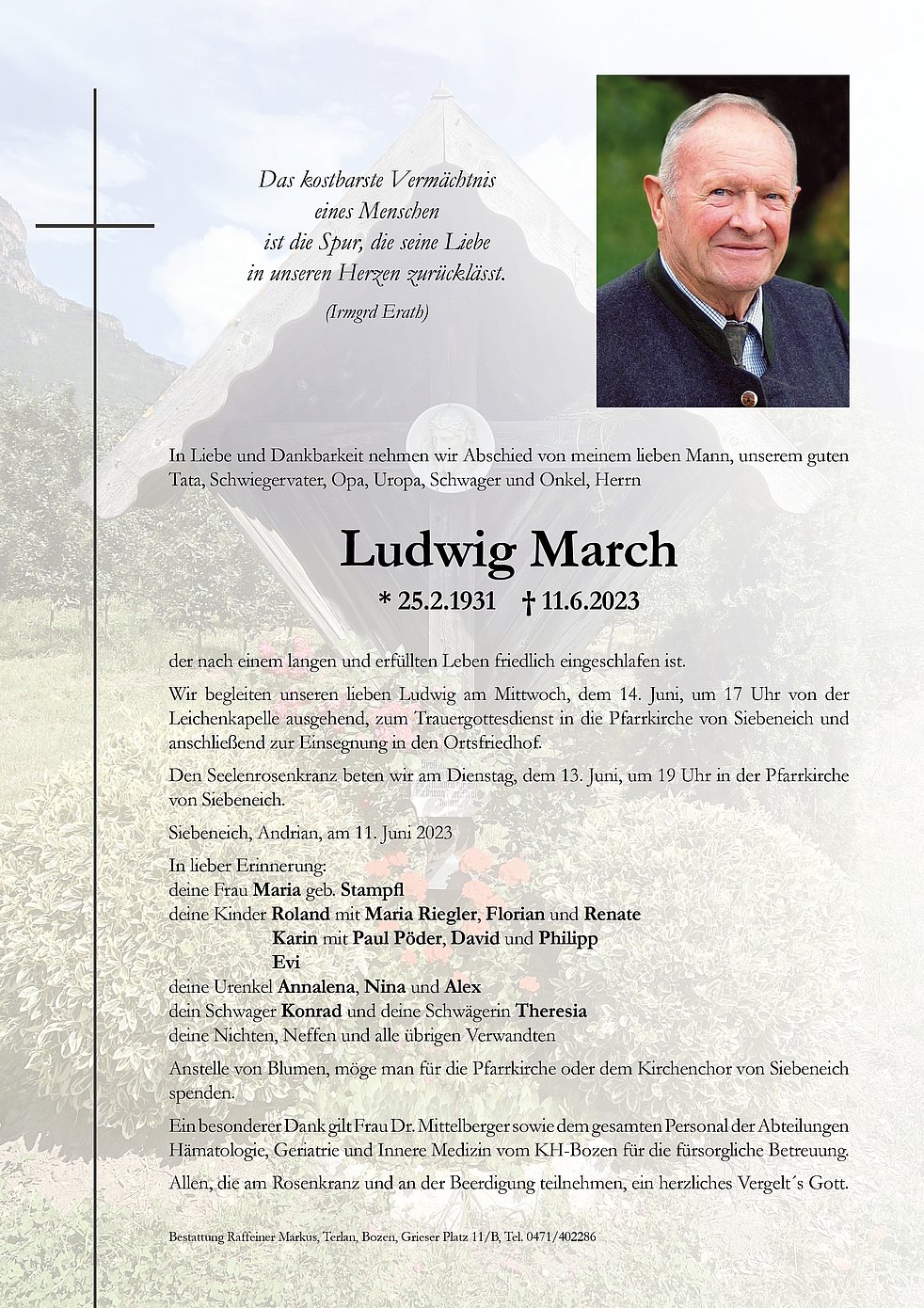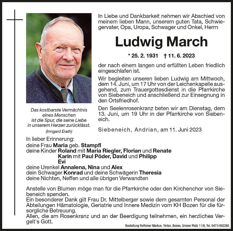 Wir begleiten unseren lieben Ludwig am Mittwoch, dem 14. Juni, um 17 Uhr von der Leichenkapelle ausgehend, zum Trauergottesdienst in die Pfarrkirche von Siebeneich und anschließend zur Einsegnung in den Ortsfriedhof.