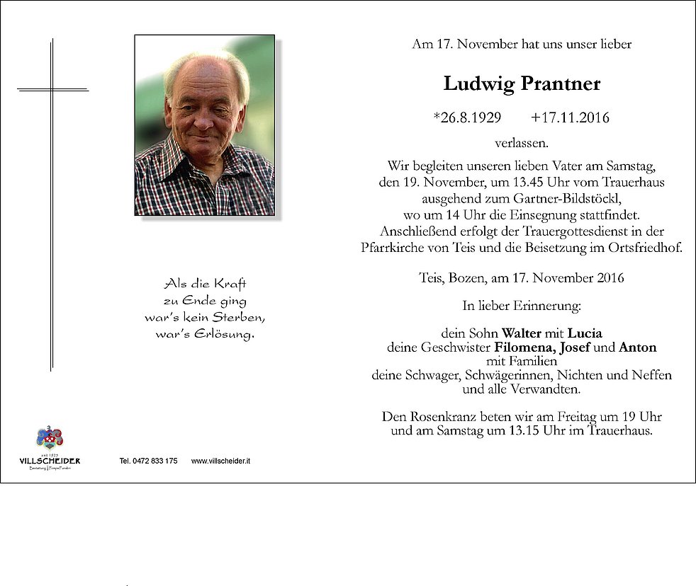 den 19. November, um 13.45 Uhr vom Trauerhaus ausgehend zum Gartner-Bildstöckl,