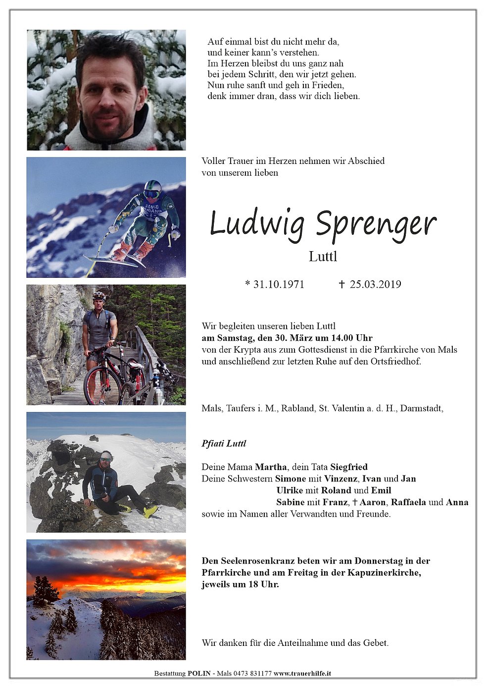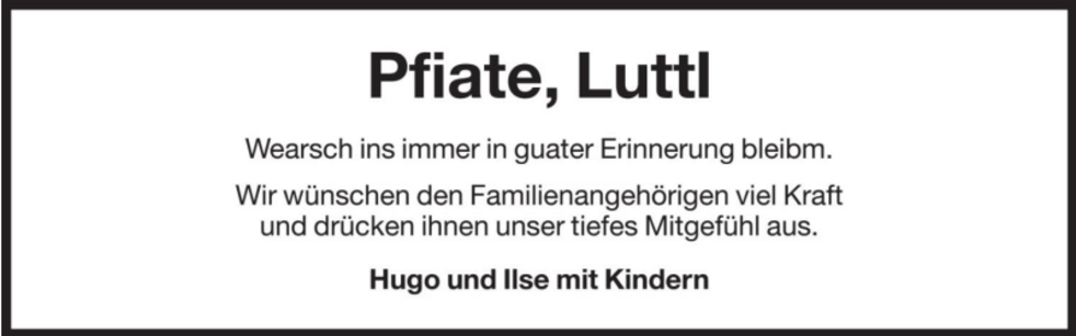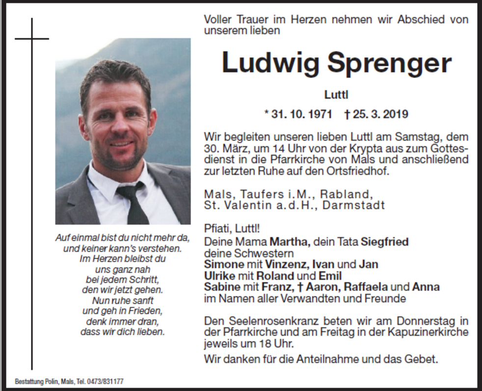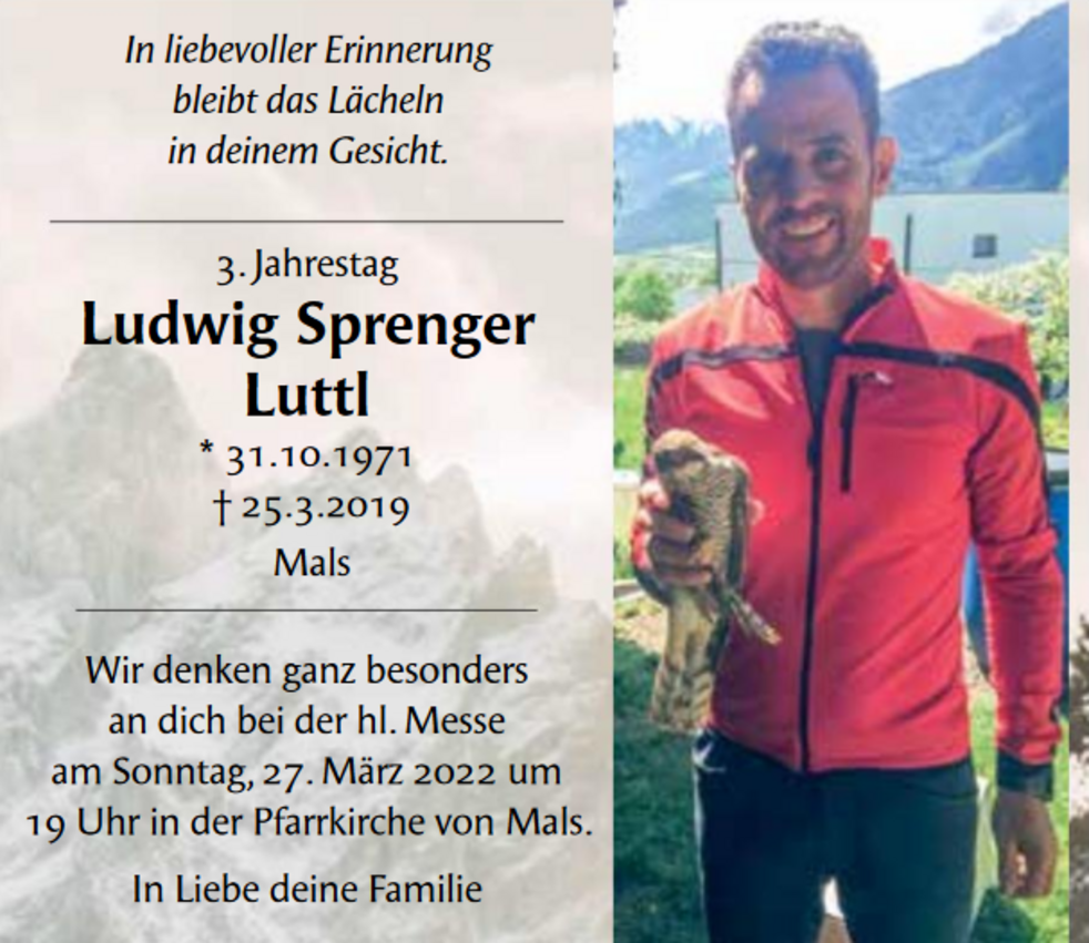 Wir begleiten unseren lieben Luttl am Samstag, den 30. März um 14.00 Uhr von der Krypta aus zum Gottesdienst in die Pfarrkirche von Mals und anschließend zur letzten Ruhe auf den Ortsfriedhof.