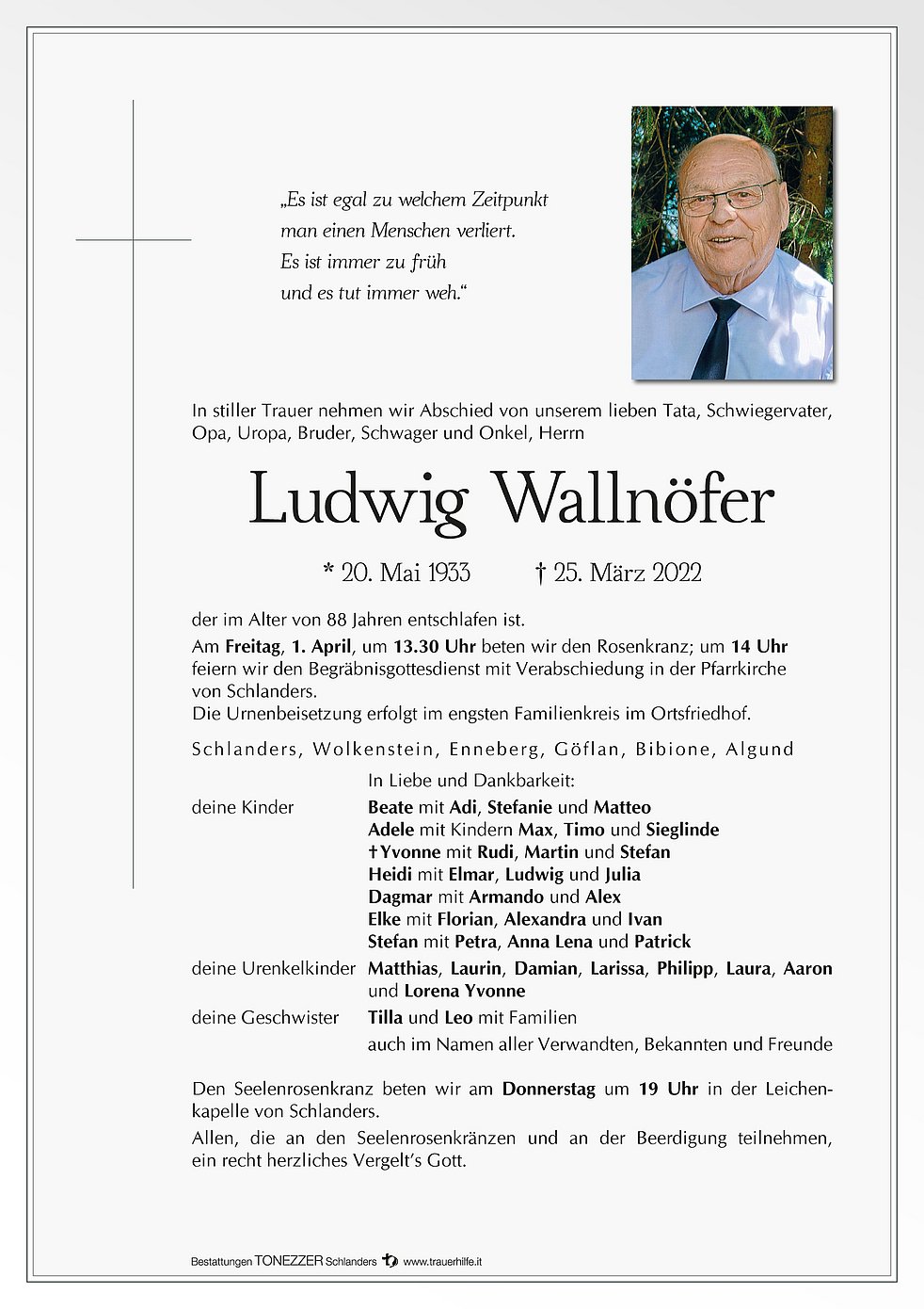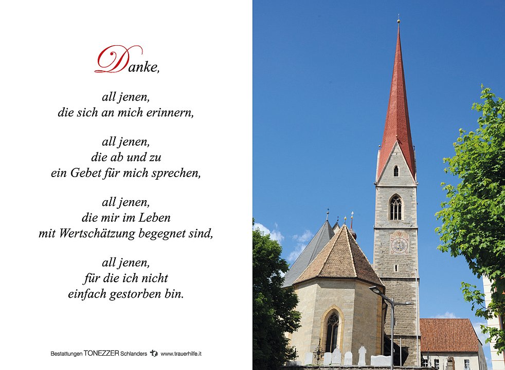 Am Freitag, 1. April, um 13.30 Uhr beten wir den Rosenkranz; um 14 Uhr feiern wir den Begräbnisgottesdienst mit Verabschiedung in der Pfarrkirche von Schlanders.