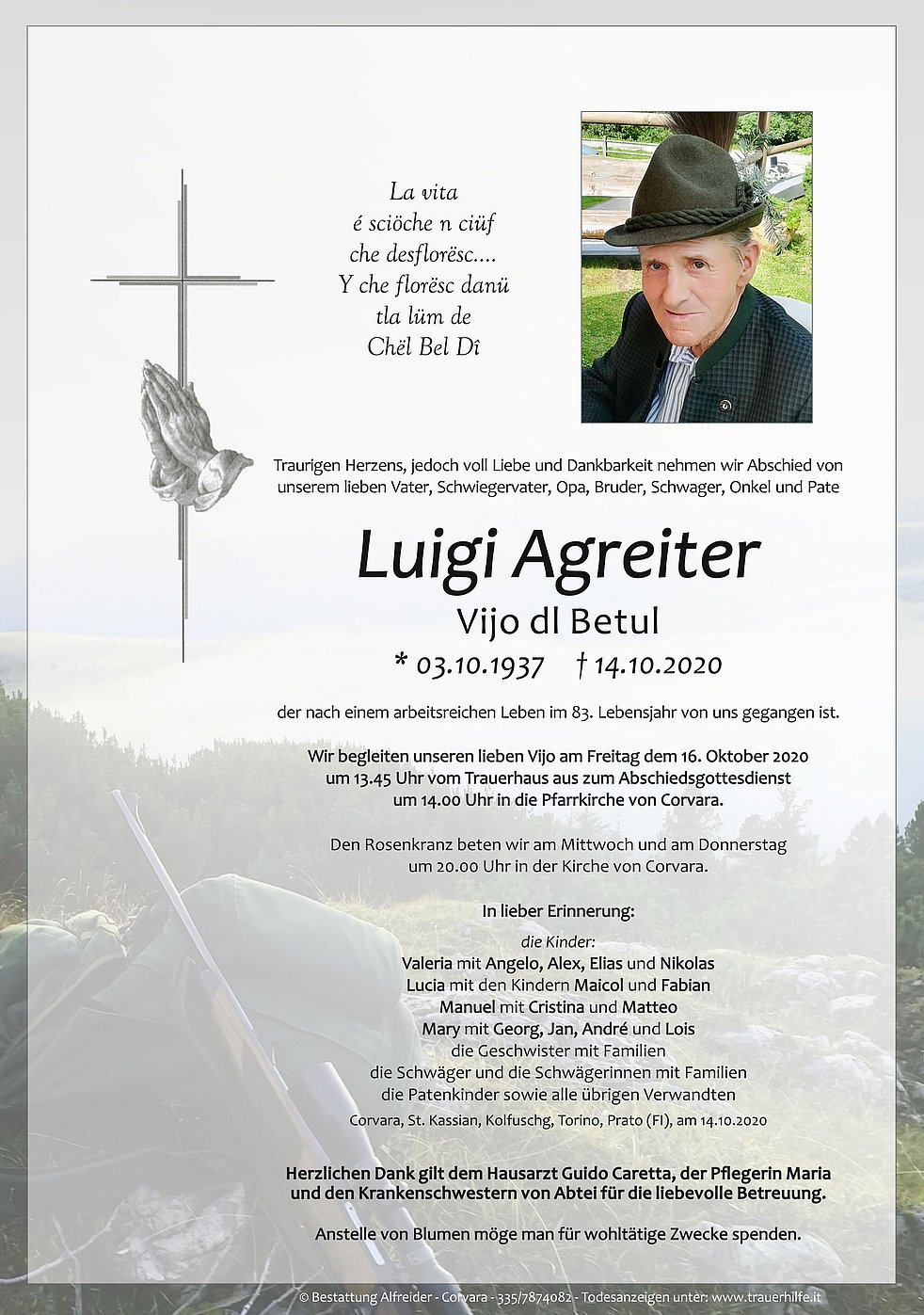 Herzlichen Dank gilt dem Hausarzt Guido Caretta, der Pflegerin Maria und den Krankenschwestern von Abtei für die liebevolle Betreuung.