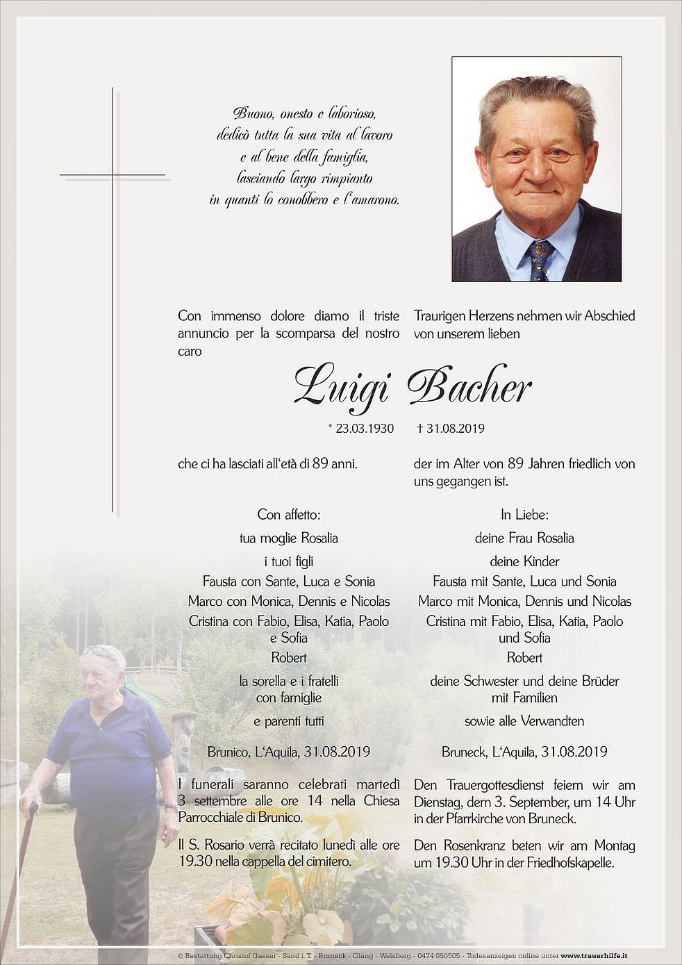 Den Trauergottesdienst feiern wir am Dienstag, dem 3. September, um 14 Uhr in der Pfarrkirche von Bruneck.