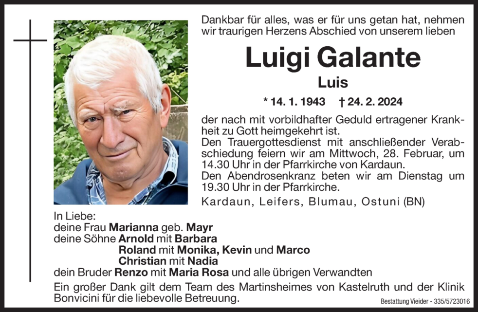 Den Trauergottesdienst mit anschließender Verabschiedung feiern wir am Mittwoch, 28. Februar, um 14.30 Uhr in der Pfarrkirche von Kardaun.