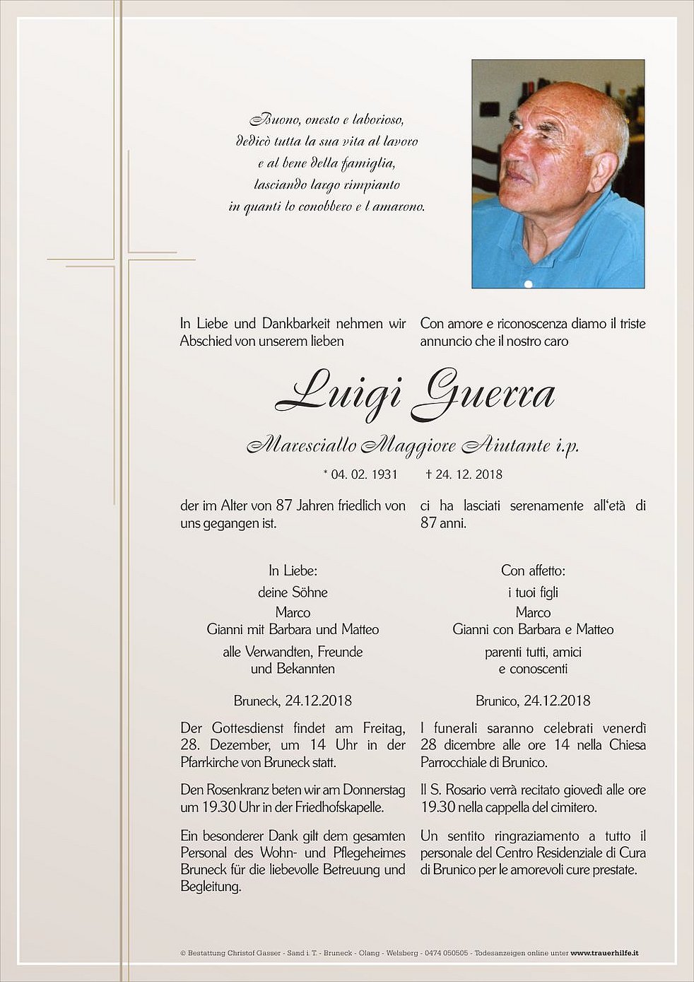 Der Gottesdienst findet am Freitag, 28. Dezember, um 14 Uhr in der Pfarrkirche von Bruneck statt.