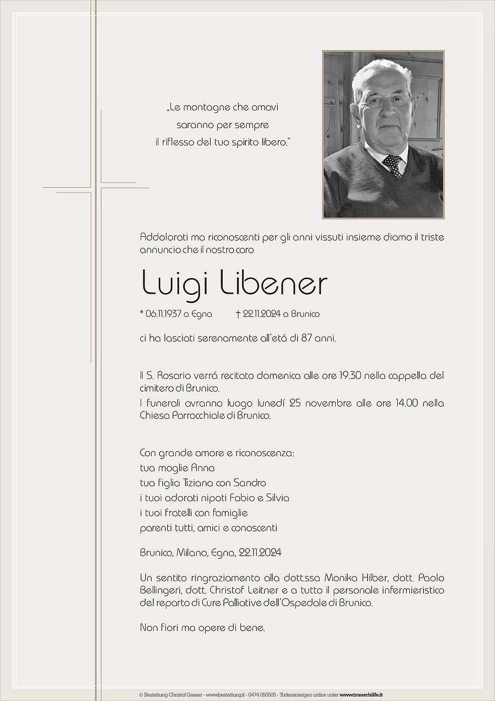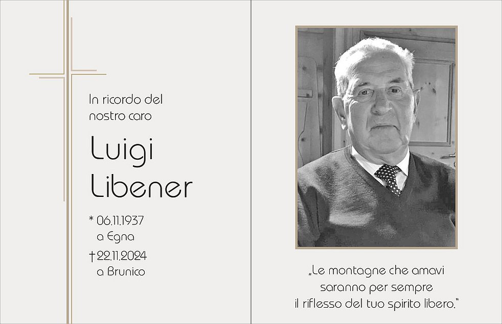 I funerali avranno luogo lunedí 25 novembre alle ore 14.00 nella Chiesa Parrocchiale di Brunico.