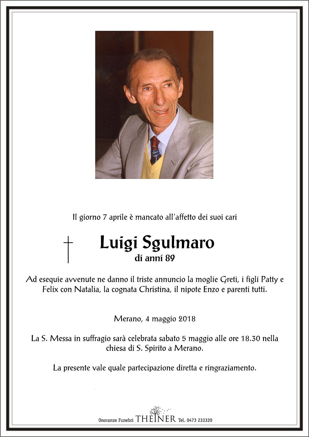 La S. Messa in suffragio sarà celebrata sabato 5 maggio alle ore 18.30 nella chiesa di S. Spirito a Merano.