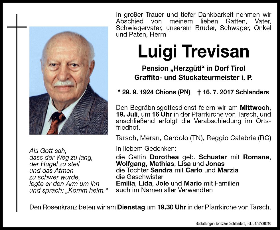 Den Begräbnisgottesdienst feiern wir am Mittwoch, 19. Juli, um 16 Uhr in der Pfarrkirche von Tarsch, und anschließend erfolgt die Verabschiedung im Ortsfriedhof.
