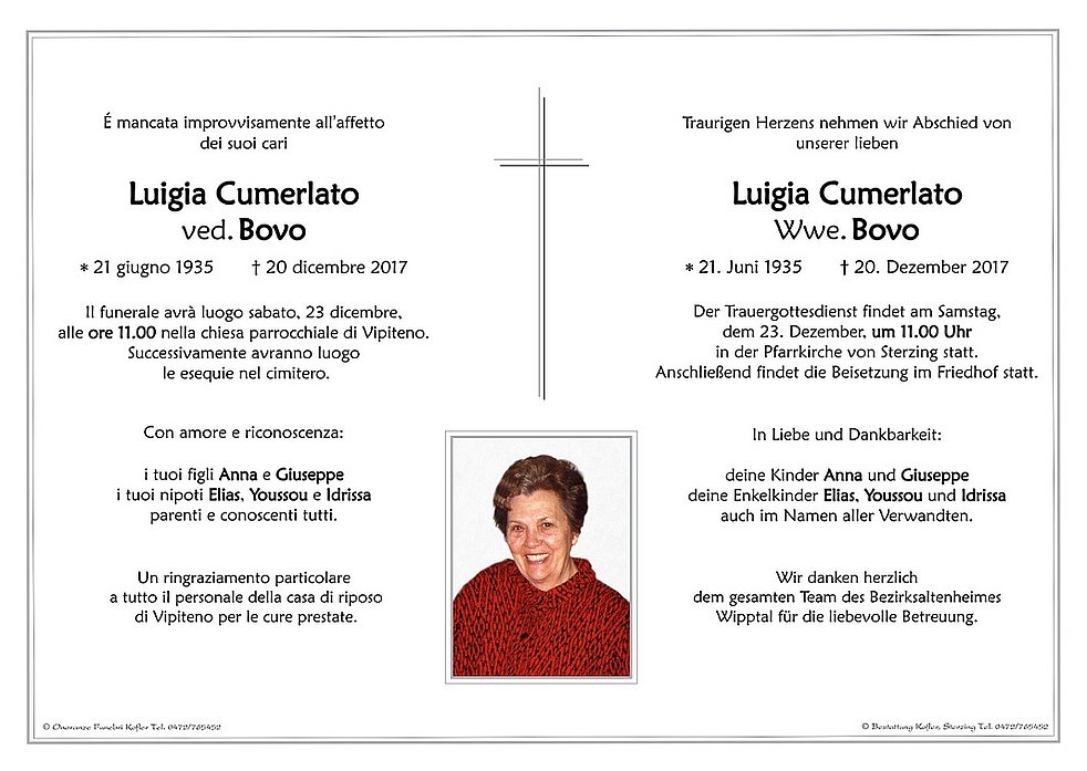 Der Trauergottesdienst findet am Samstag, dem 23. Dezember, um 11.00 Uhr in der Pfarrkirche von Sterzing statt. Anschließend findet die Beisetzung im Friedhof statt.