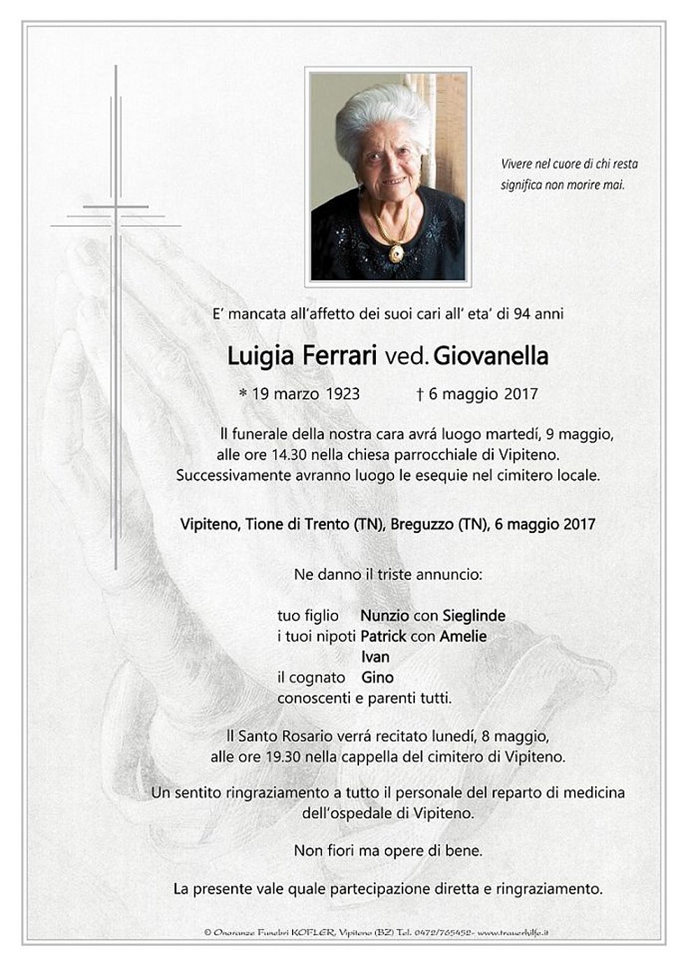 Il funerale della nostra cara avrá luogo martedí, 9 maggio, alle ore 14.30 nella chiesa parrocchiale di Vipiteno. Successivamente avranno luogo le esequie nel cimitero locale.