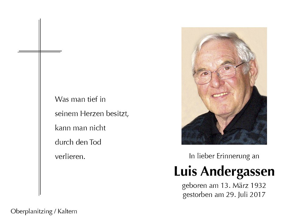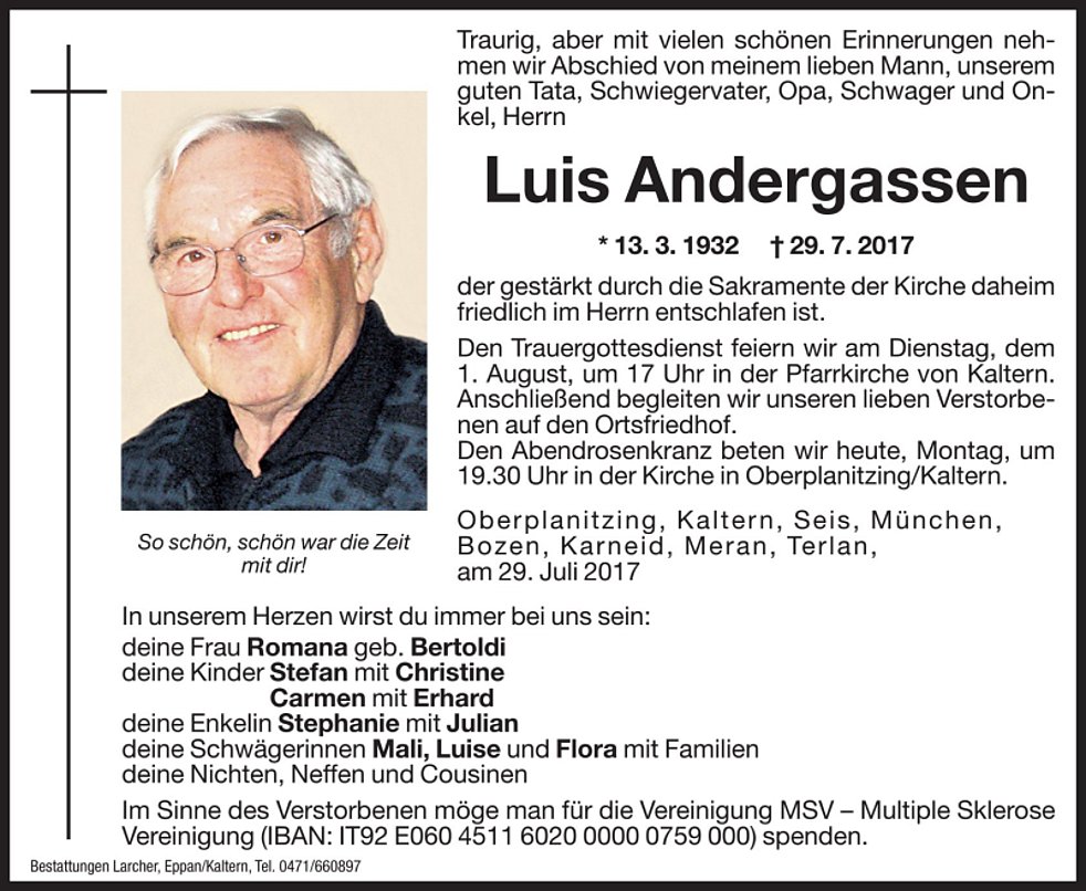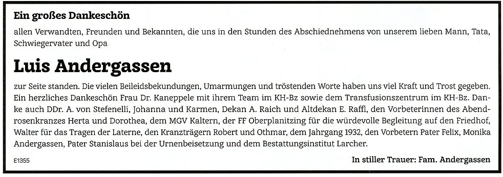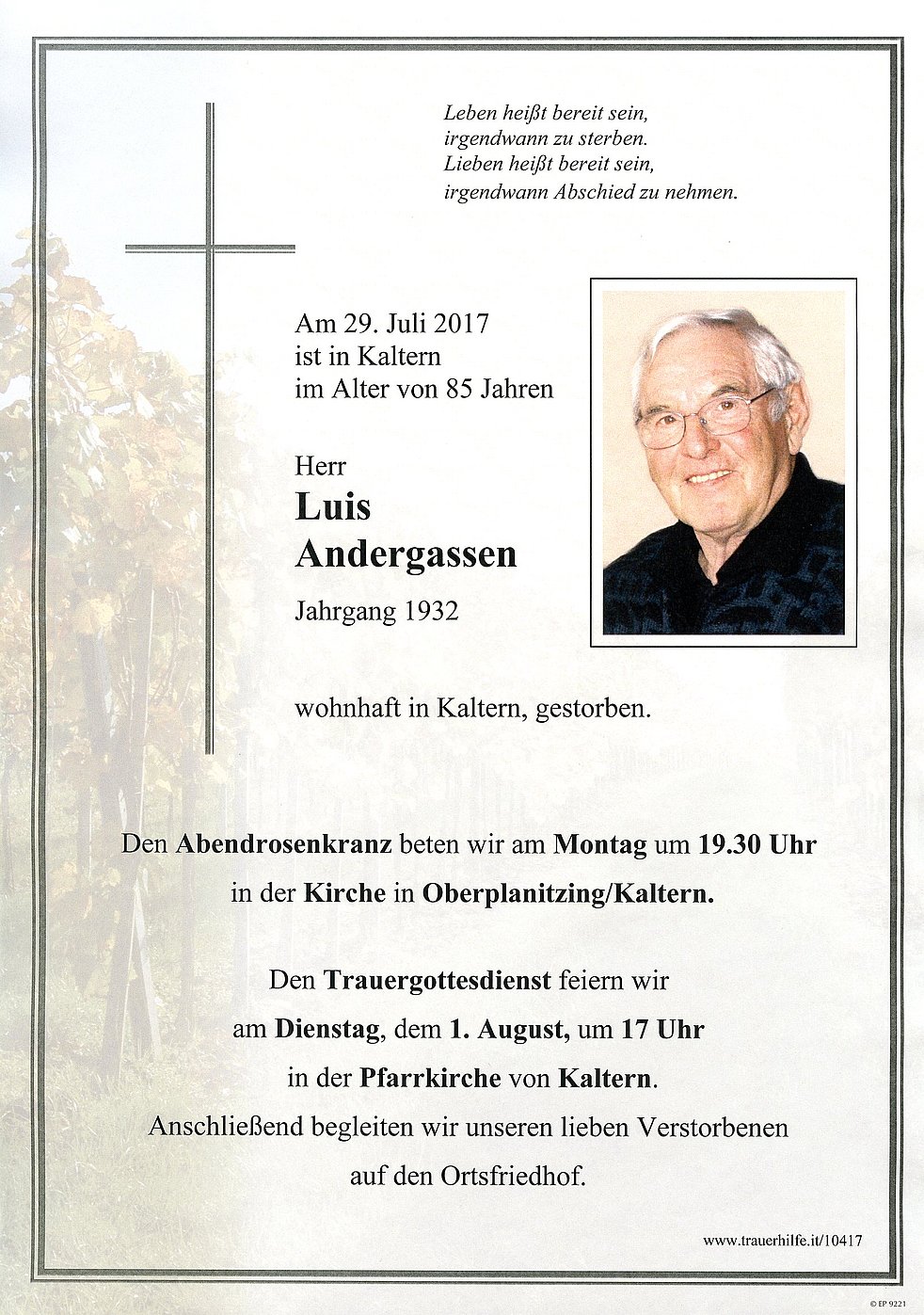 Den Trauergottesdienst feiern wir am Dienstag, dem 1. August um 17 Uhr in der Pfarrkirche von Kaltern. Anschließend begleiten wir unseren lieben Verstorbenen auf den Ortsfriedhof.