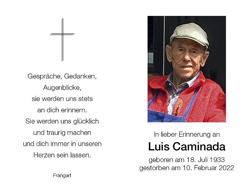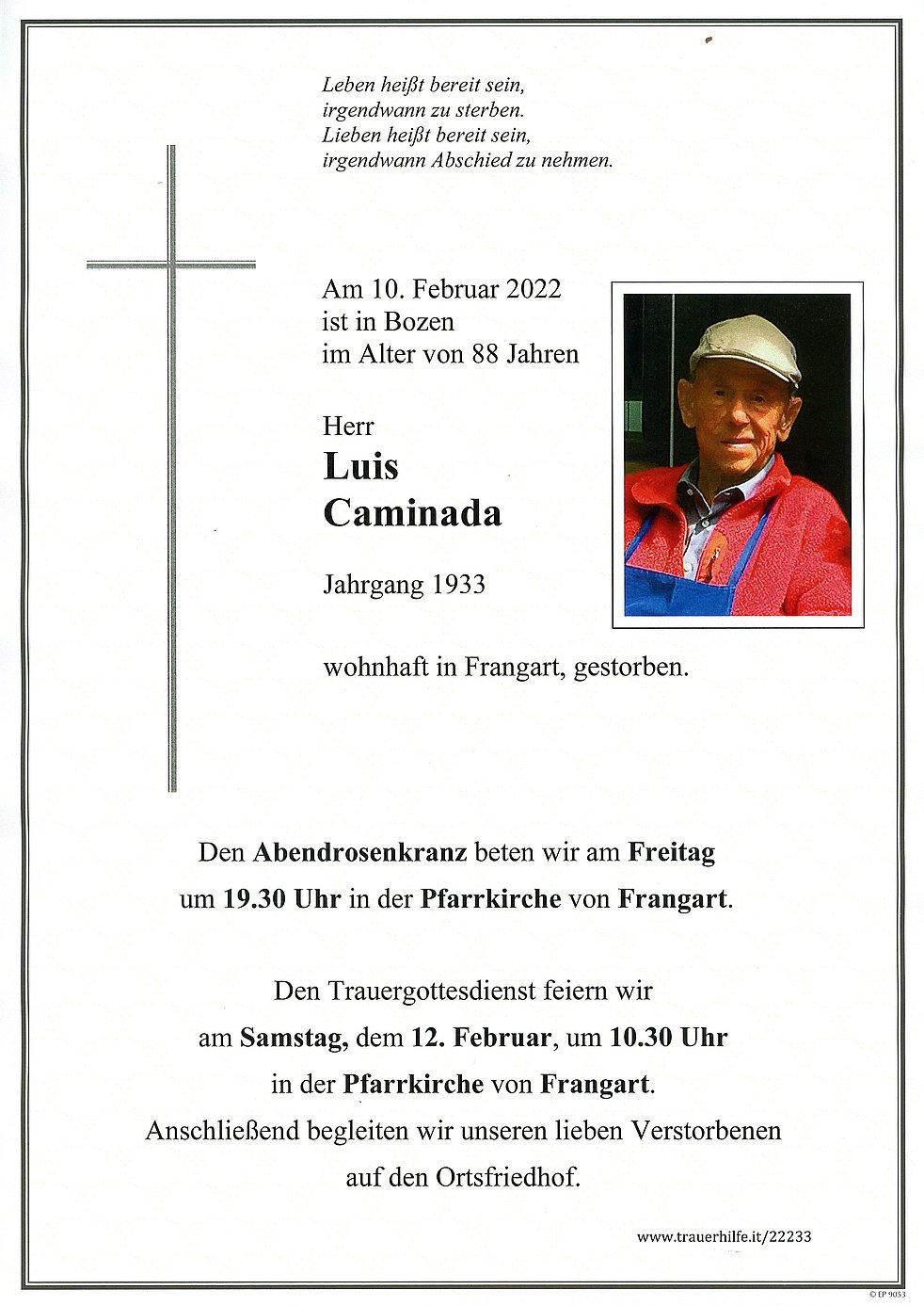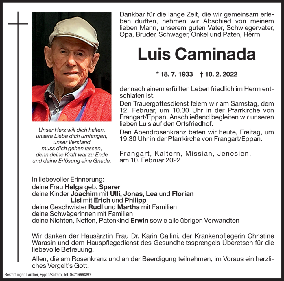 Den Trauergottesdienst feiern wir am Samstag, dem 12. Februar um 10.30 Uhr in der Pfarrkirche von Frangart/Eppan. Anschließend begleiten wir unseren lieben Luis auf den Ortsfriedhof.
