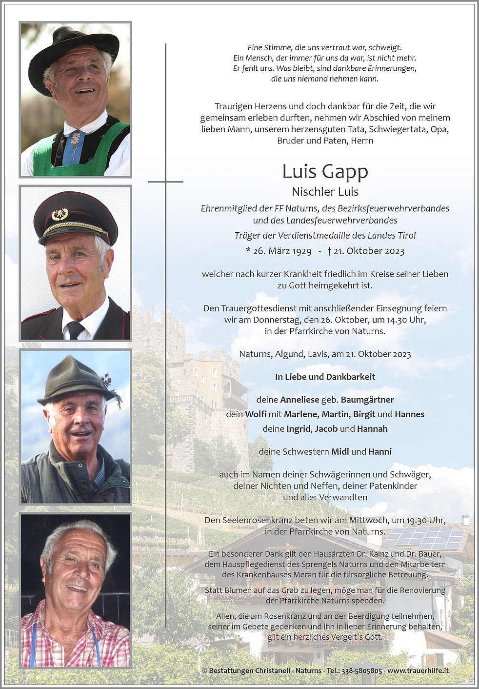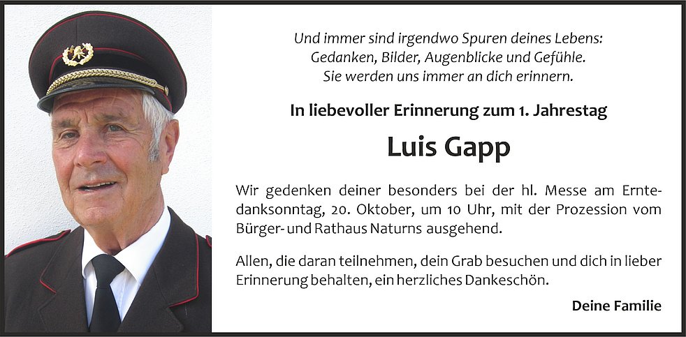 Den Trauergottesdienst mit anschließender Einsegnung feiern wir am Donnerstag, den 26. Oktober, um 14.30 Uhr, in der Pfarrkirche von Naturns.