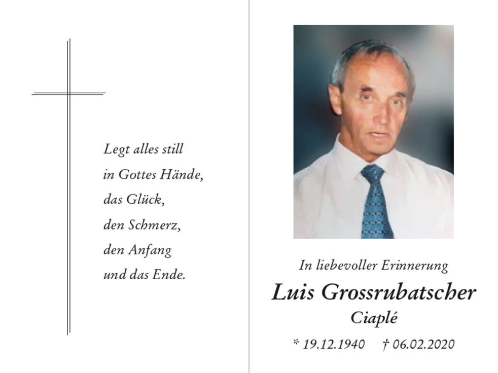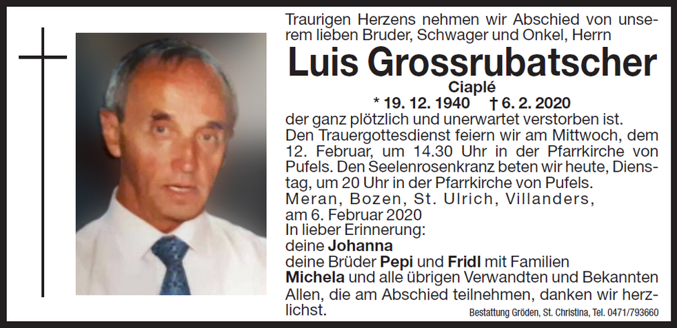 Den Sterbegottesdienst feiern wir am Mittwoch, dem 12. Februar, um 14.30 Uhr in der Pfarrkirche von Pufels.
