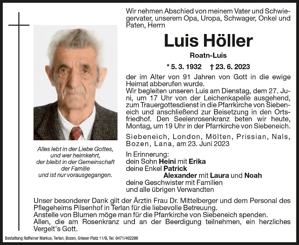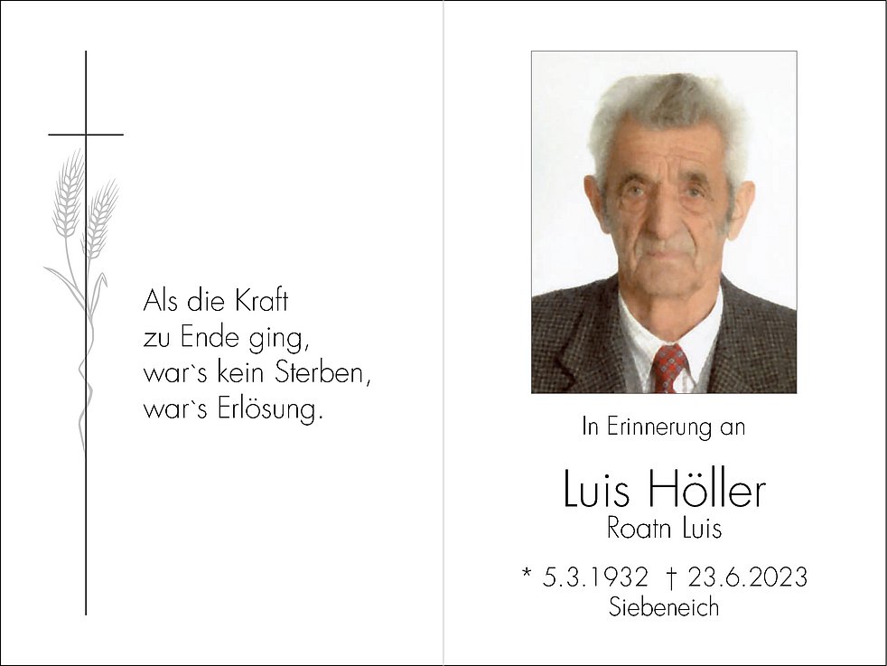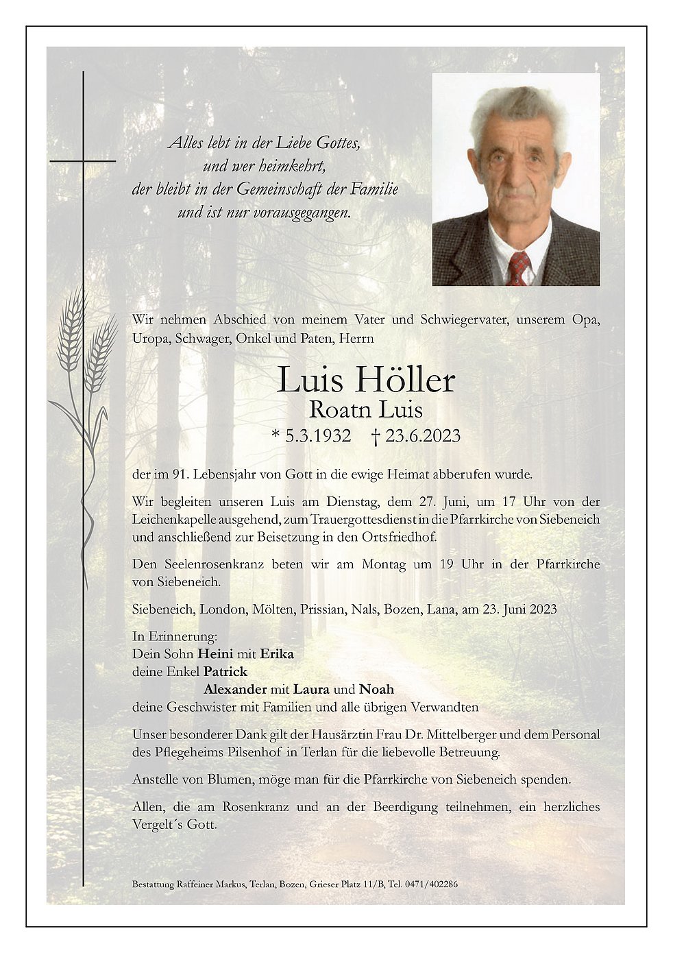 Wir begleiten unseren Luis am Dienstag, dem 27. Juni, um 17 Uhr von der Leichenkapelle ausgehend, zum Trauergottesdienst in die Pfarrkirche von Siebeneich und anschließend zur Beisetzung in den Ortsfriedhof.