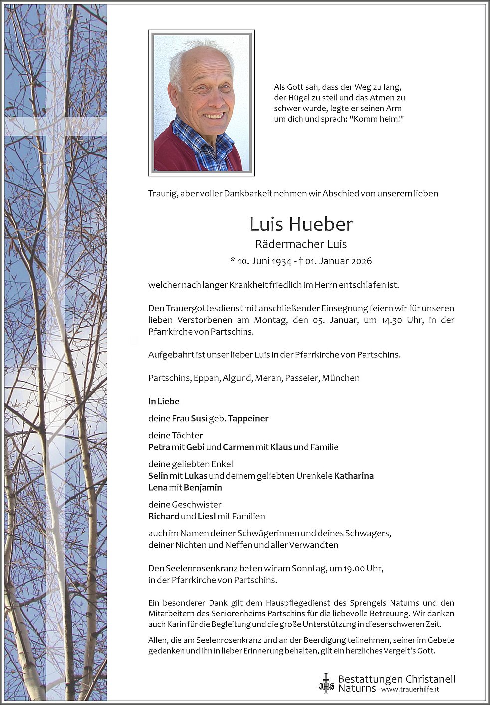 Den Trauergottesdienst mit anschließender Einsegnung feiern wir für unseren lieben Verstorbenen am Montag, den 05. Januar, um 14.30 Uhr, in der Pfarrkirche von Partschins.