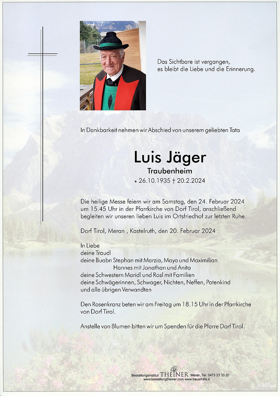 Die heilige Messe feiern wir am Samstag, den 24. Februar 2024 um 15.45 Uhr in der Pfarrkirche von Dorf Tirol, anschließend begleiten wir unseren lieben Luis im Ortsfriedhof zur letzten Ruhe.