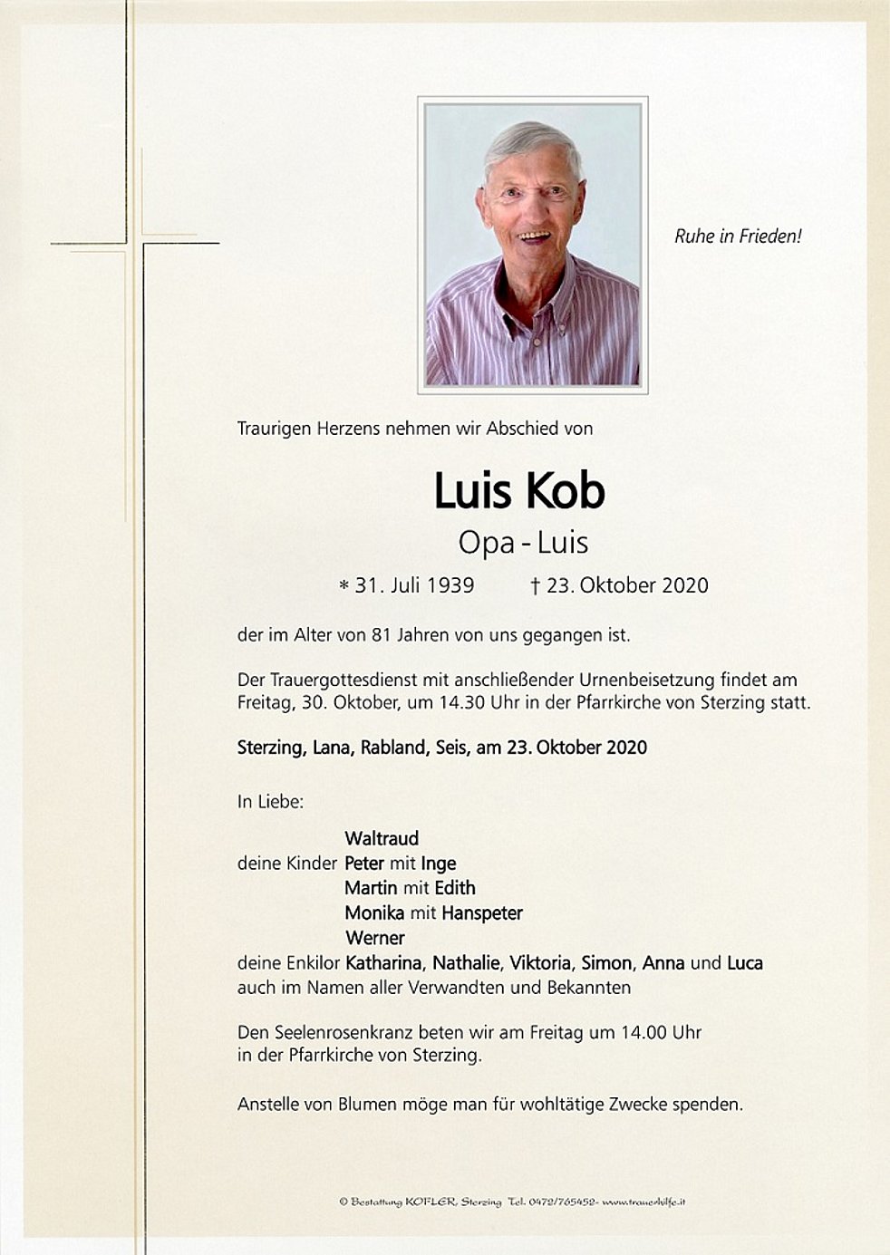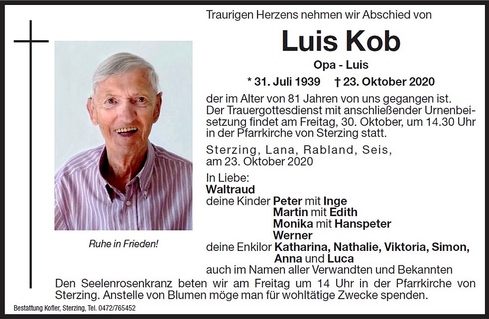 Der Trauergottesdienst mit anschließender Urnenbeisetzung findet am Freitag, 30. Oktober, um 14.30 Uhr in der Pfarrkirche von Sterzing statt.