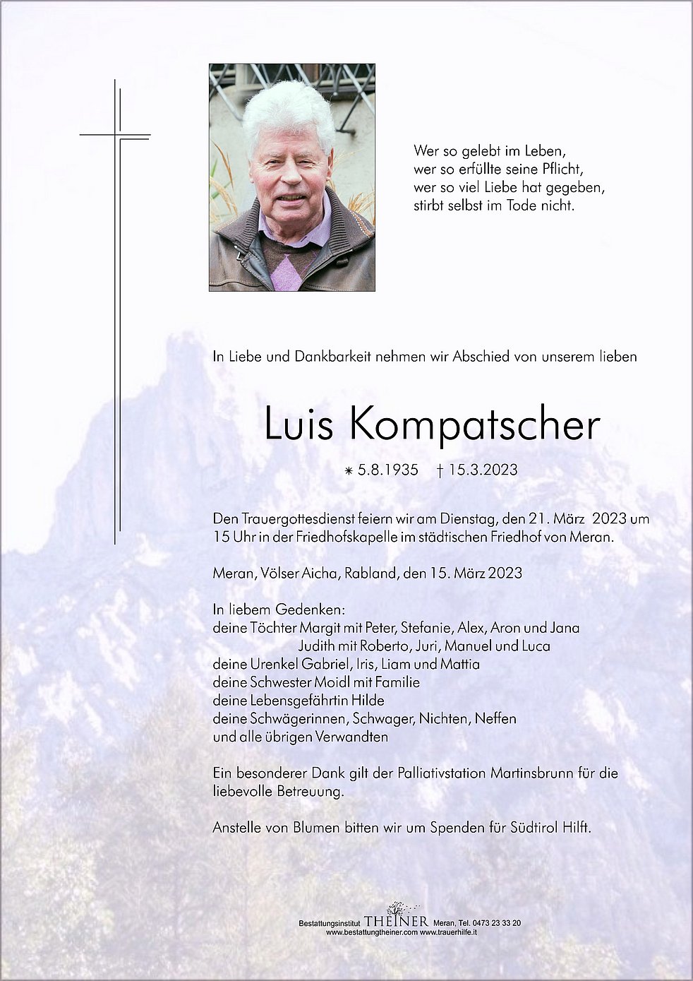 Den Trauergottesdienst feiern wir am Dienstag, den 21. März 2023 um 15 Uhr in der Friedhofskapelle im städtischen Friedhof von Meran.