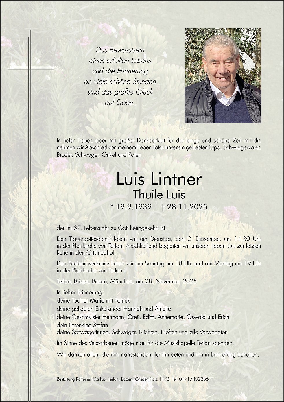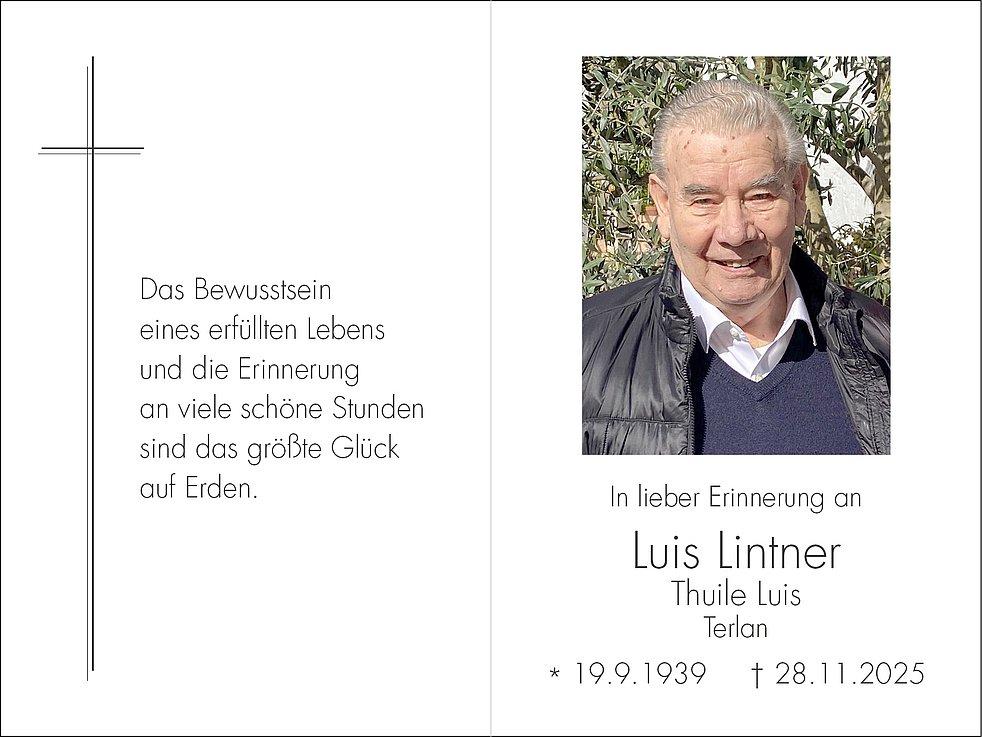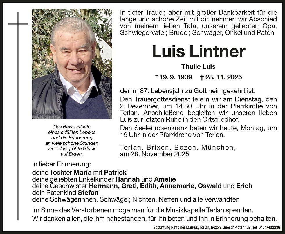 Den Trauergottesdienst feiern wir am Dienstag, den 2. Dezember, um 14.30 Uhr in der Pfarrkirche von Terlan. Anschließend begleiten wir unseren lieben Luis zur letzten Ruhe in den Ortsfriedhof.