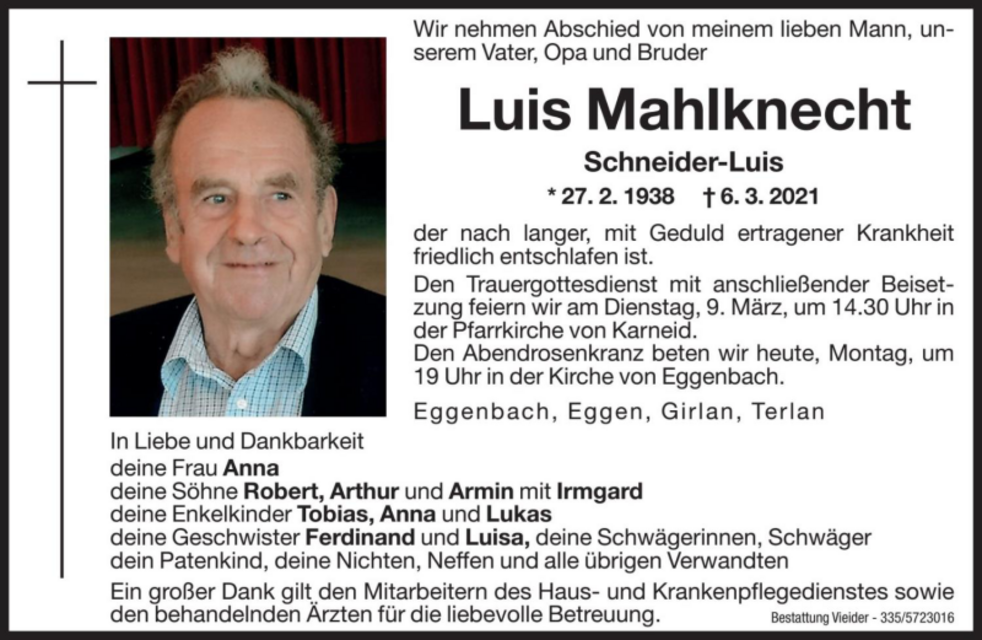 Den Trauergottesdienst mit anschließender Beisetzung feiern wir am Dienstag, 9. März, um 14.30 Uhr in der Pfarrkirche von Karneid.
