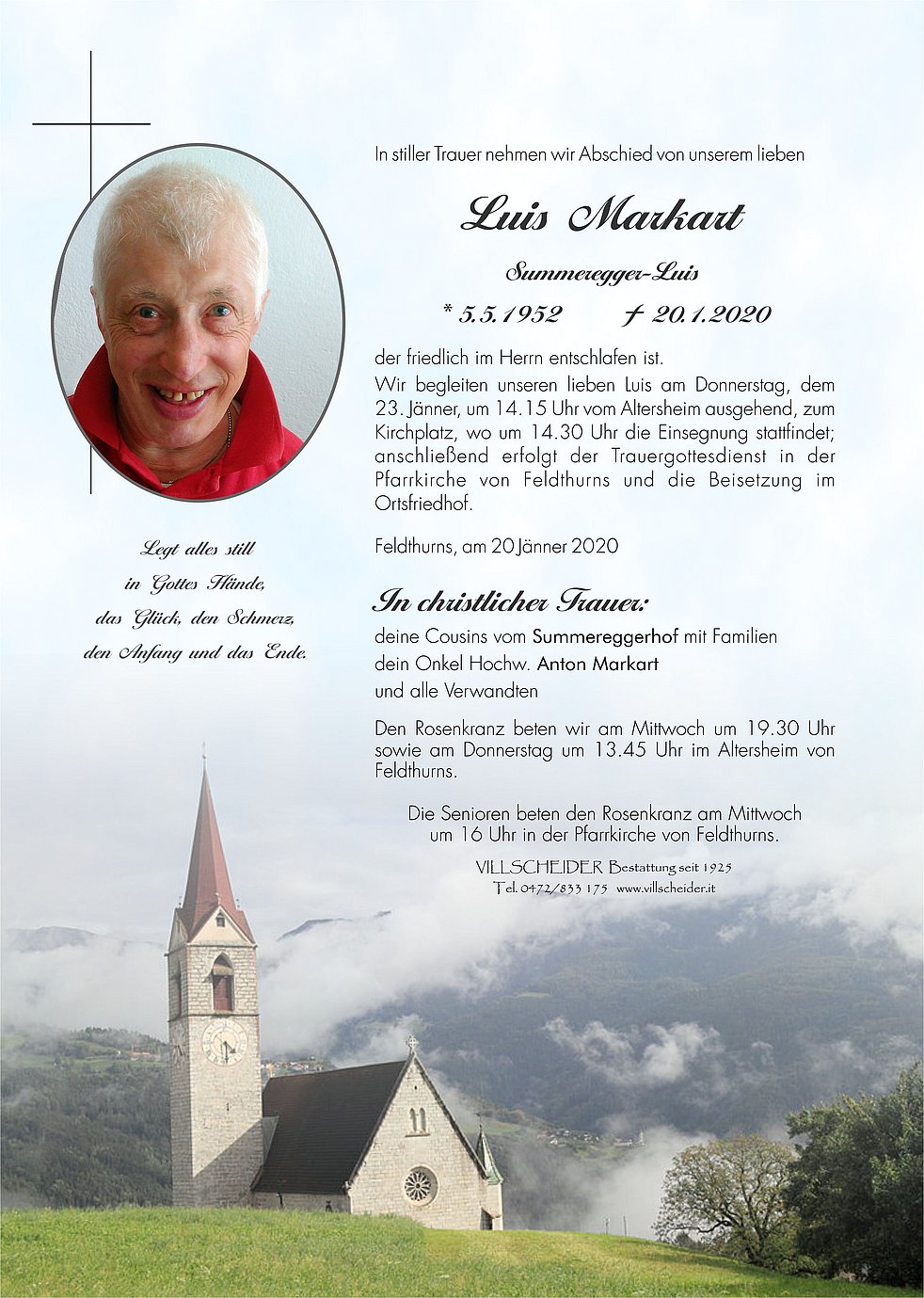 Begräbnisgottesdienst: 23.01. - 14:30 Uhr Feldthurns