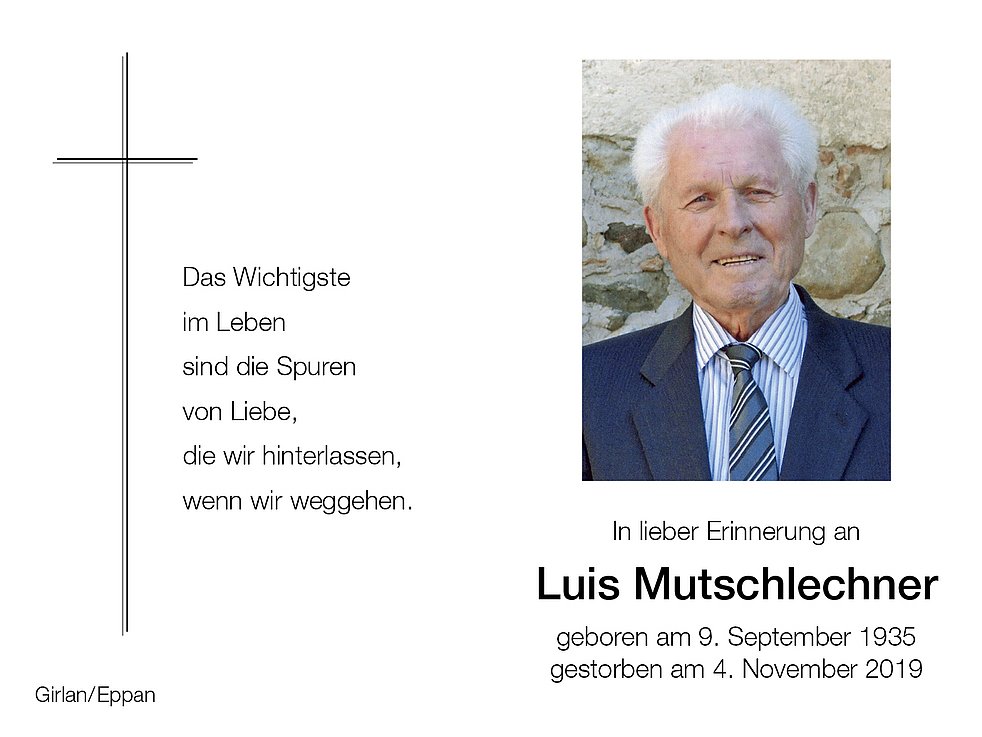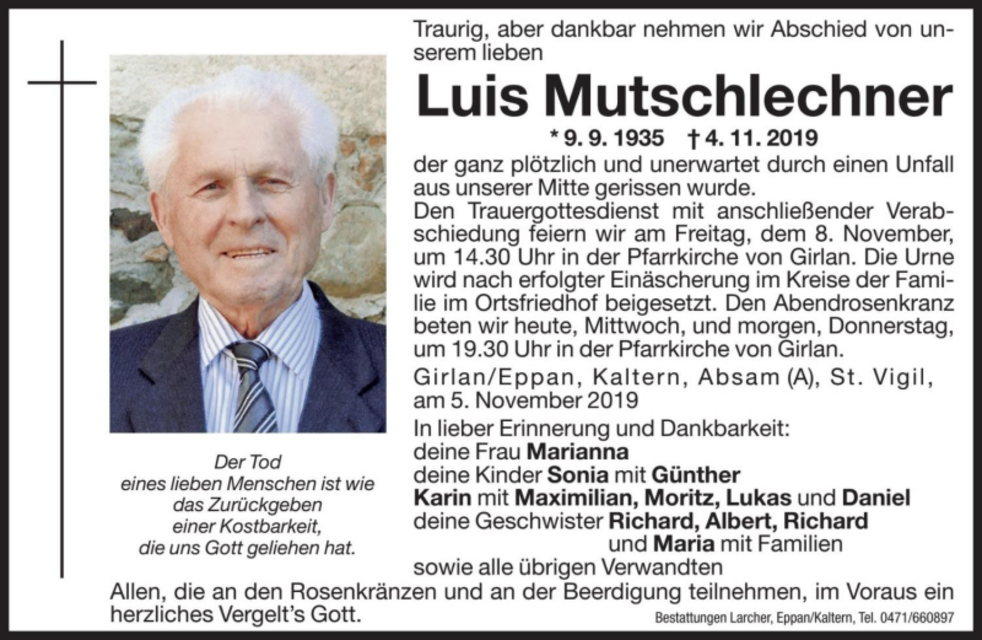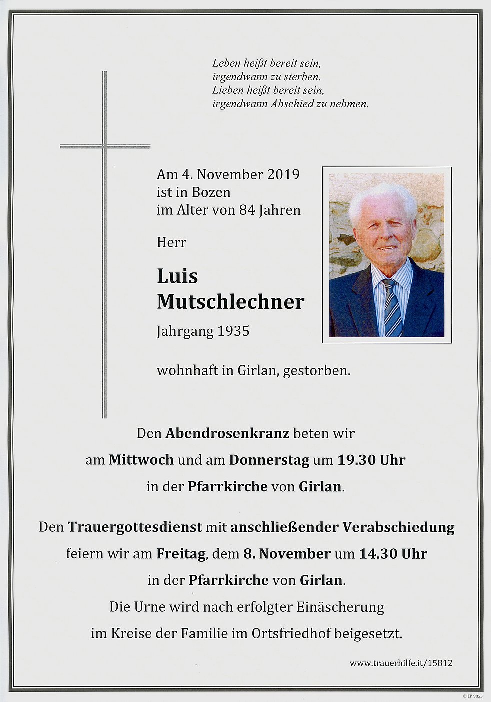 Den Trauergottesdienst mit anschließender Verabschiedung feiern wir am Freitag, dem 8. November um 14.30 Uhr in der Pfarrkirche von Girlan. Die Urne wird nach erfolgter Einäscherung im Kreise der Familie im Ortsfriedhof beigesetzt. Den Abendrosenkranz beten wir am Mittwoch, und am Donnerstag, um 19. 30 Uhr in der Pfarrkirche von Girlan.