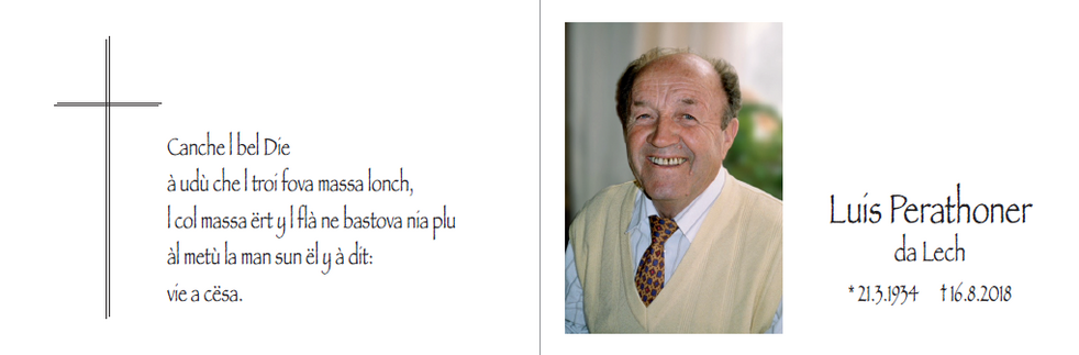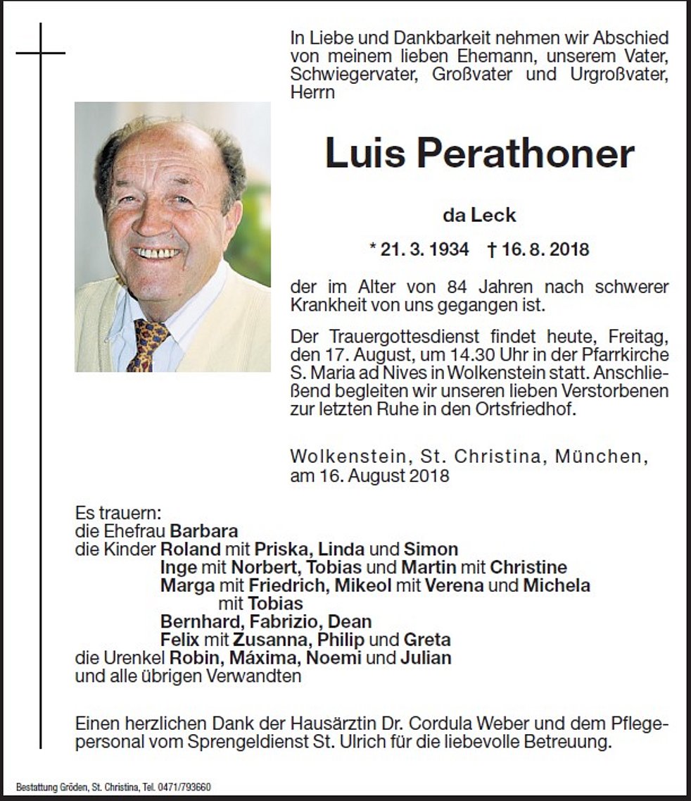 Der Trauergottesdienst findet am Freitag, den 17. August, um 14.30 Uhr in der Pfarrkirche S. Maria ad Nives in Wolkenstein statt.