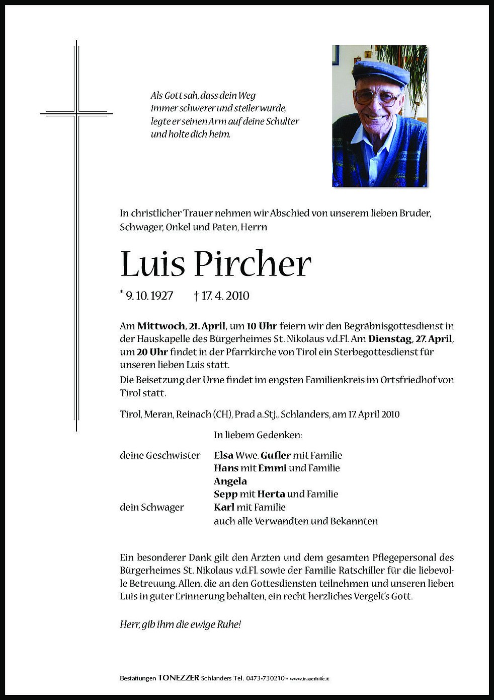 Am Dienstag, 27. April, um 20 Uhr findet in der Pfarrkirche von Tirol ein Sterbegottesdienst für unseren lieben Luis statt.