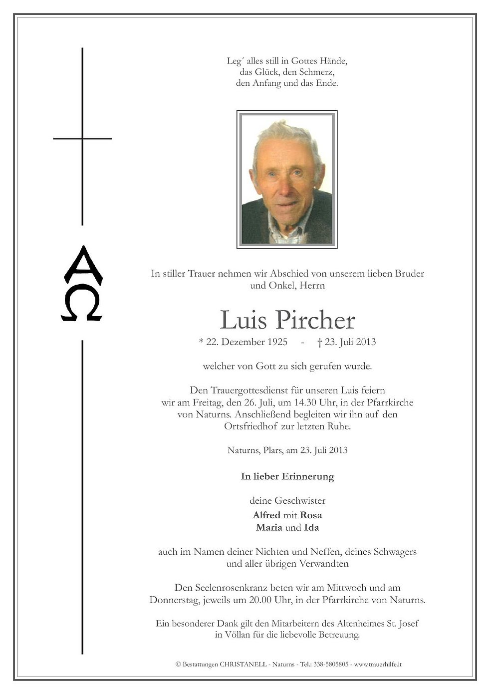 Den Trauergottesdienst für unseren lieben Verstorbenen feiern wir am Freitag, den 26. Juli, um 14.30 Uhr, in der Pfarrkirche von Naturns. Anschließend begleiten wir ihn auf den Ortsfriedhof zur letzten Ruhe.
