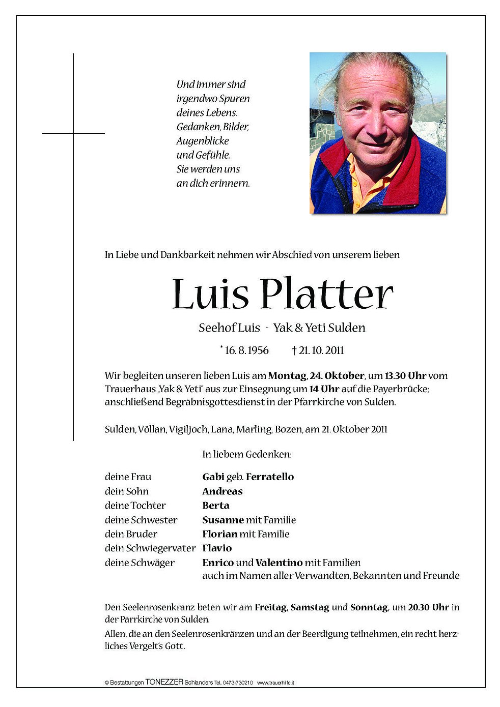 Un caloroso abbraccio alla famiglia Platter in ricordo del Sig. Luis che ci ha lasciati troppo presto. Il ricordo della sua accoglienza allo Yak und Yeti ci accompagna anche quando siamo lontani da Solda. Non mancheremo di portare le nostre condoglianze di persona