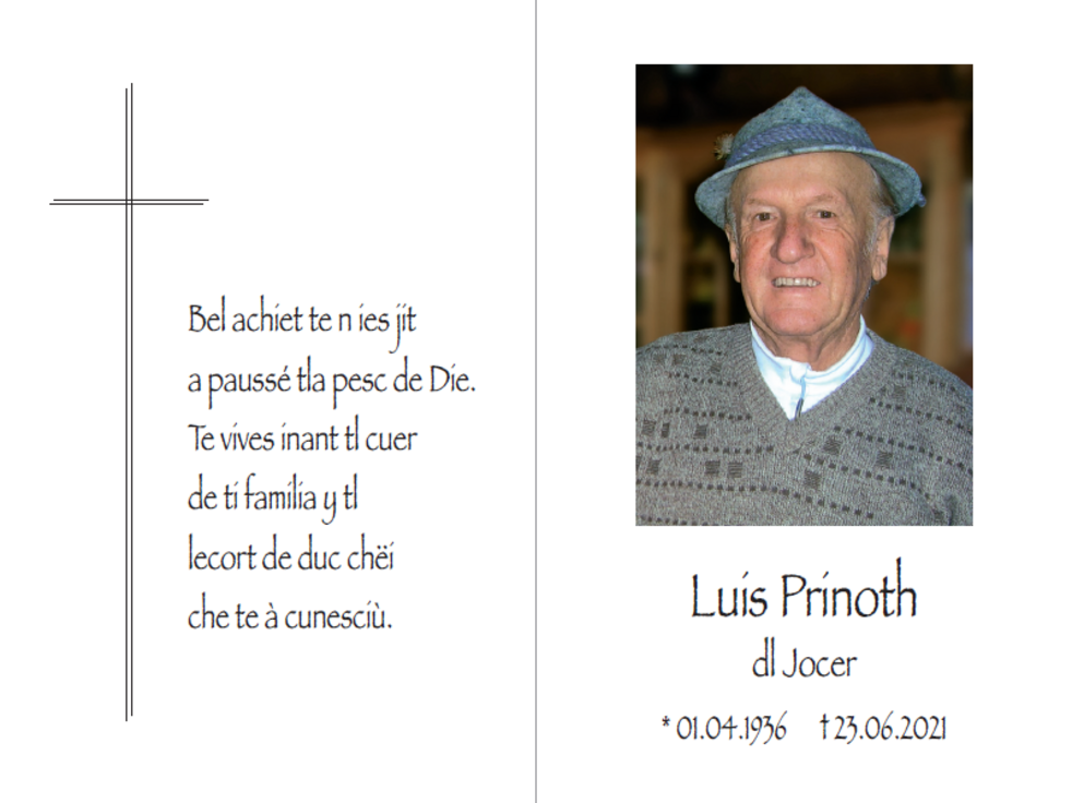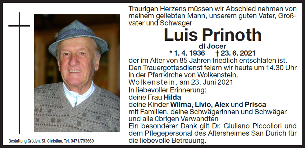 Den Trauergottesdienst feiern wir am Freitag, dem 25. Juni, um 14.30 Uhr in der Pfarrkirche von Wolkenstein.